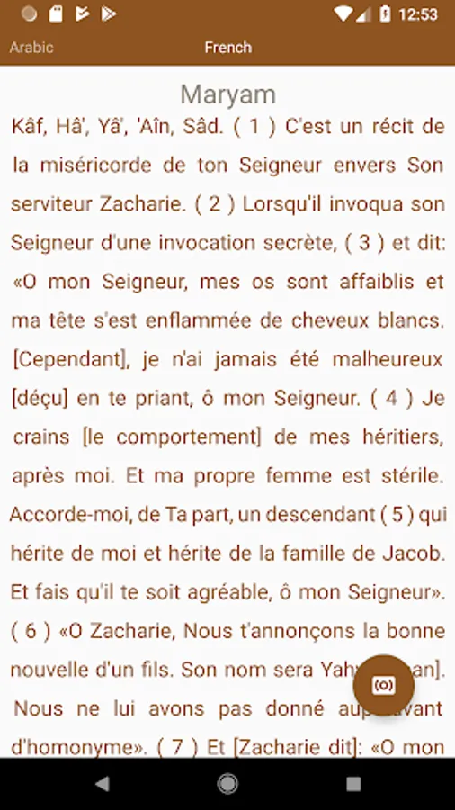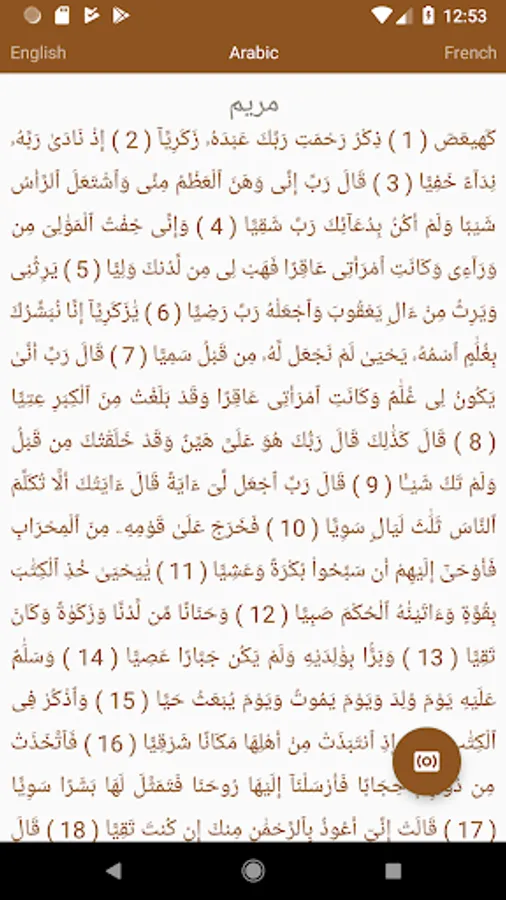 - Holy Quran's Text in Arabic, English and French to follow with the respective recitations