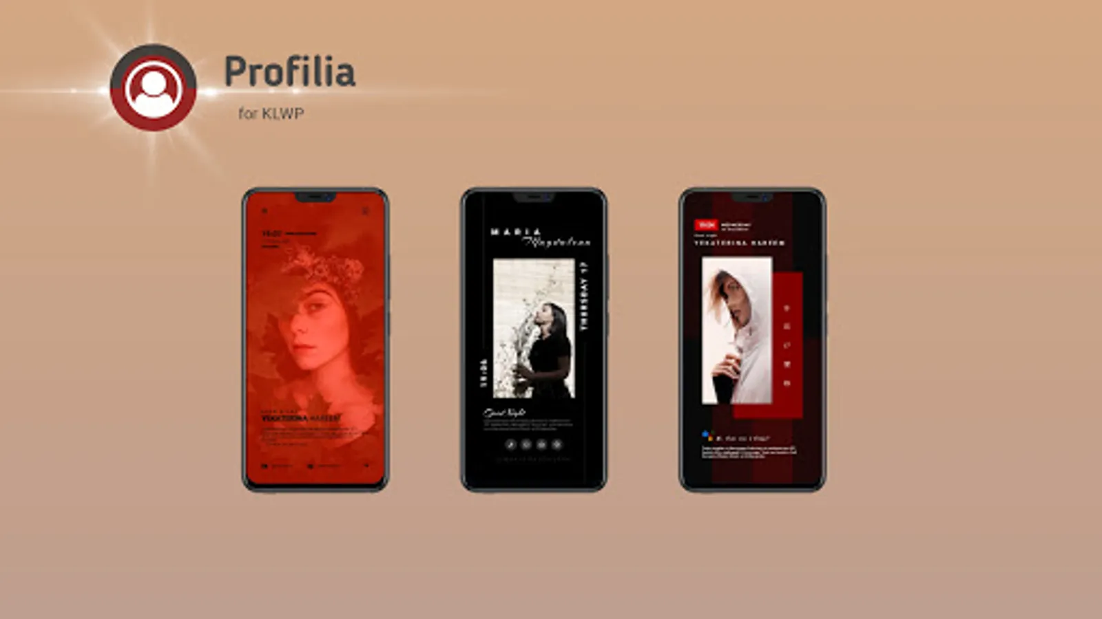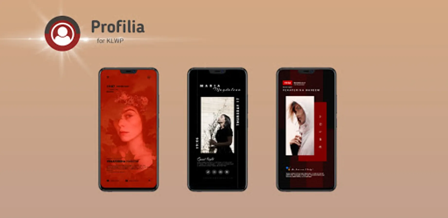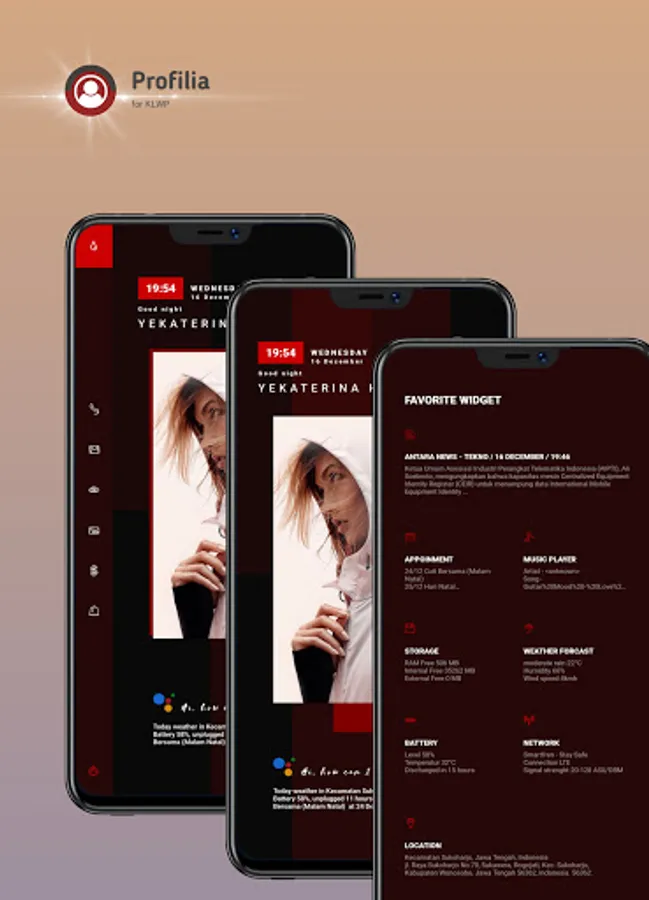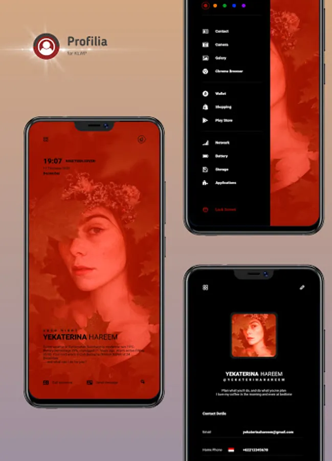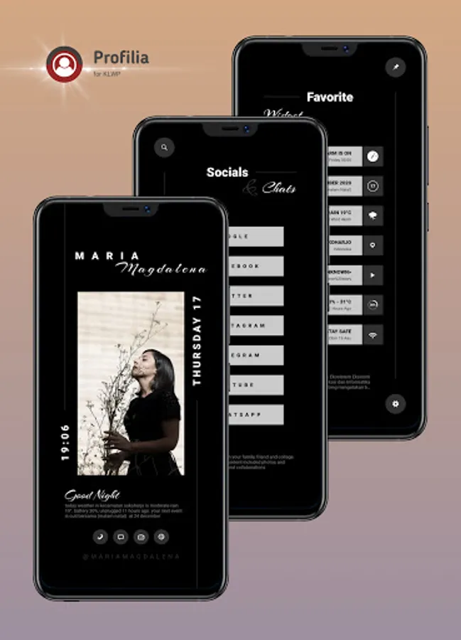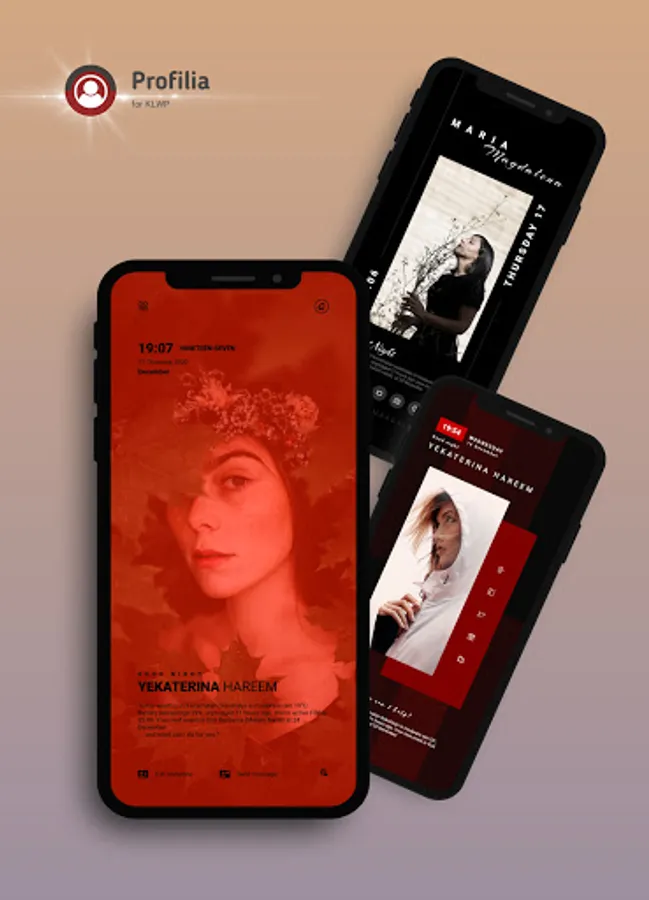 Profilia for KLWP provides 3 types of presets for your home screen. Each consists of 3 pages on the KLWP and Nova Launcher applications. Switch from default page to page with sliding animation and find your favorite app.