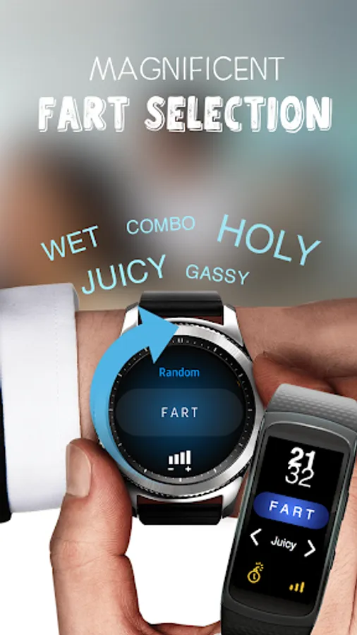 Choose many ridicolously fun farts with rotary bezel or just choose random farts to make it more unpredictable. You can also select other sound pack from your phone.