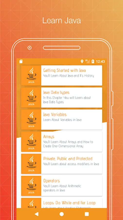 Orion - Android Tutorial guides you through, all the phases of 'Android App Development’.It is brief Java Tutorial as Well. Android Development has become a crucial skill in the field of Computer Science/Computer Programming.Whether it is Kotlin for Android or Java Tutorial, Or You are a beginner or Intermediate App developer our Orion Android Tutorial Will Always Help You To Learn Android App Development. It has great in-depth information about Android App Development & Kotlin for Android.Also, you can Learn Java if you are a complete beginner in Android Development. Orion Android Tutorial app helps you enhance easily and interactively, without getting into all the painful information. It abstracts the details for you and helps you focus on key point required to Learn Android App Development.You Don't Need to have any Degree in Computer Science/Computer Programming to get started with this Course.