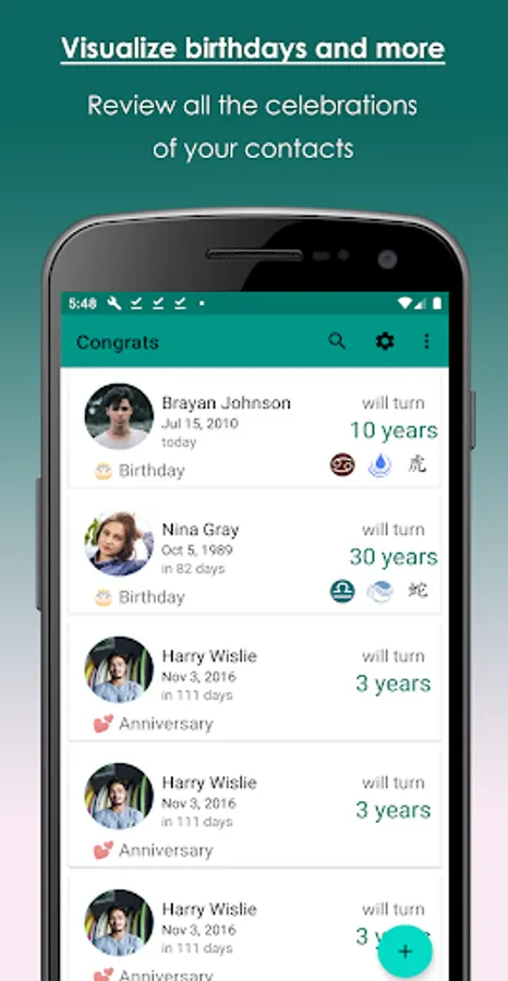 We also provide you interesting information about your contact birthdays, you will not forget the age of people, or what's their horoscope.
