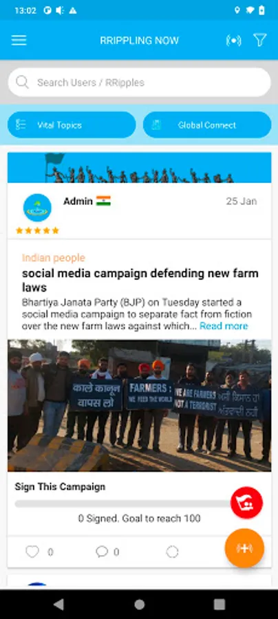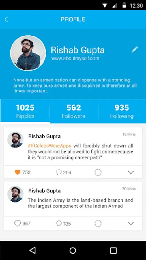 RRipple is a Microblogging app with two editorial contents (Vital Topics and Global Connect). It is meant to allow users to post content as text, photo and video. Users would be able to “like”, "comment" and “share” posts of other users .A user would be able to select accounts which he/she would follow and would be able to view his/her own followers.