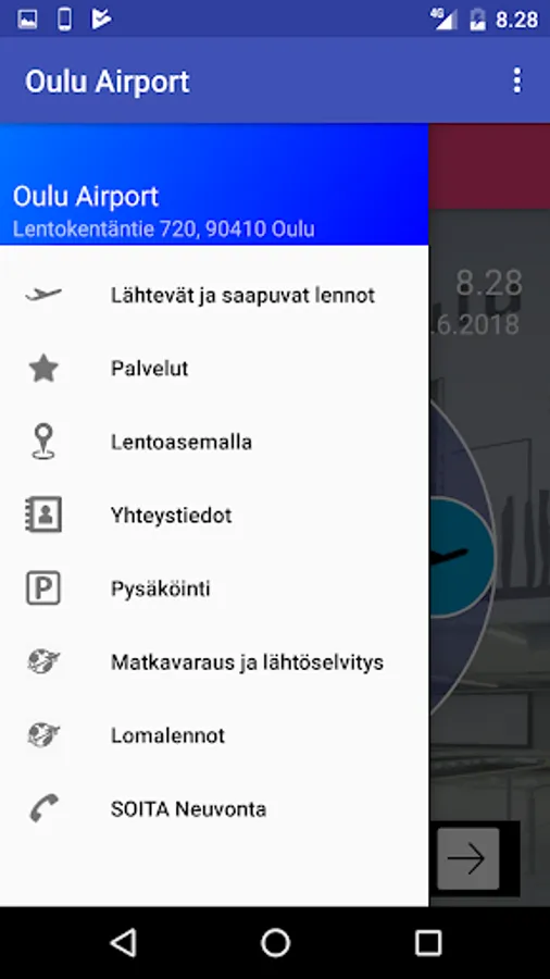 This simple and easy to use application seems to Oulu airport arriving and departing flights, services, airlines and travel agencies, contact information and parking. Flights and Travel tab, you can go take a look and book flights and tours offered by travel agencies and airlines, or to check in.