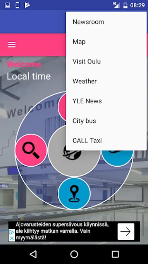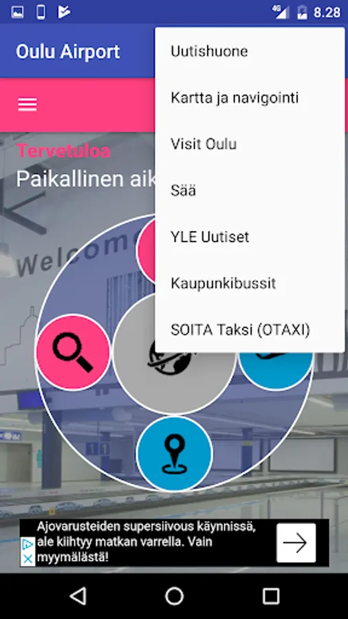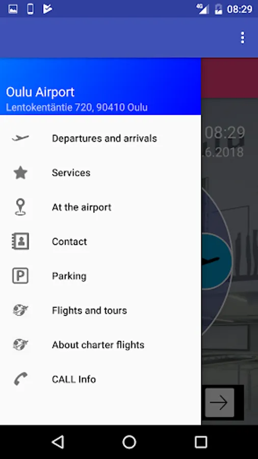 This simple and easy to use application seems to Oulu Airport arriving and departing flights, services, airlines and travel agencies, liaison and parking information. Flights and Travel tab, you can go take a look and book flights and trips offered by the airlines and travel agencies, or check in.