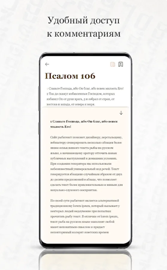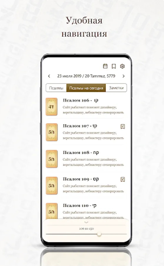In order to make reading the Psalms more accessible and convenient for Russian-speaking Jews, in addition to the original text, the application also has its phonetic transcription, as well as a translation into Russian, which allows people who do not speak Hebrew to understand the meaning of the Psalms and pronounce them in the original language .