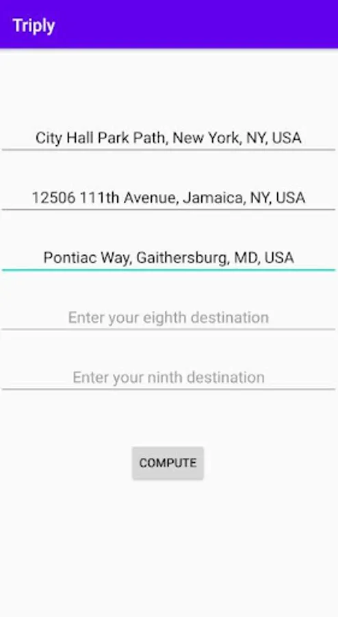 Triply finds the optimal route to take when you have to make multiple stops along the way. With seamless cross-functionality with Google Maps, routing the way to your final destination is quick and easy! Just input the addresses you're visiting, and Triply will guide you along the fastest way to get to each of them.