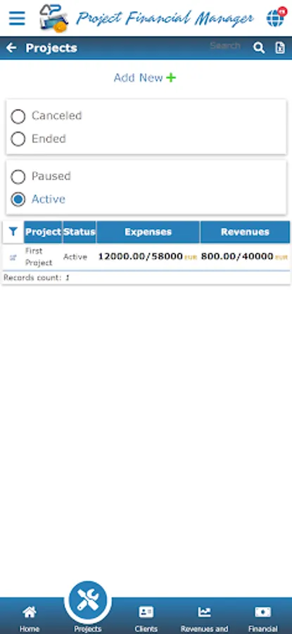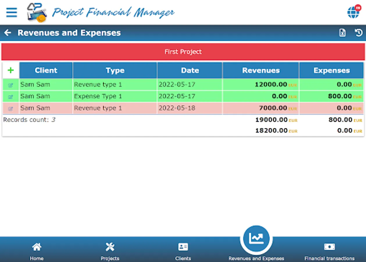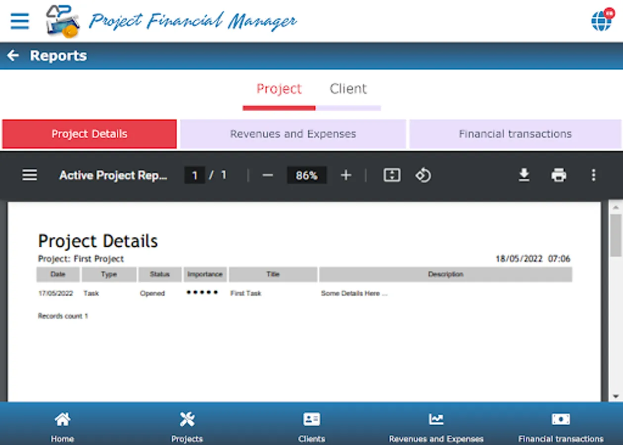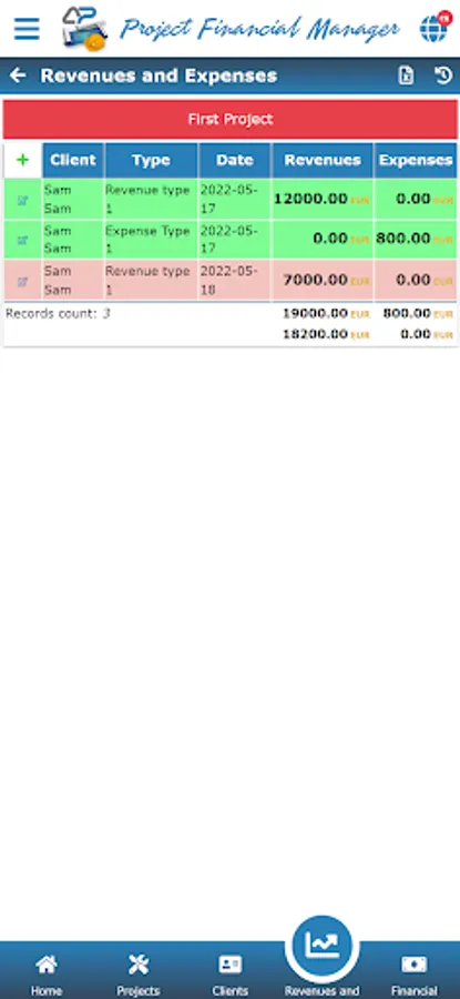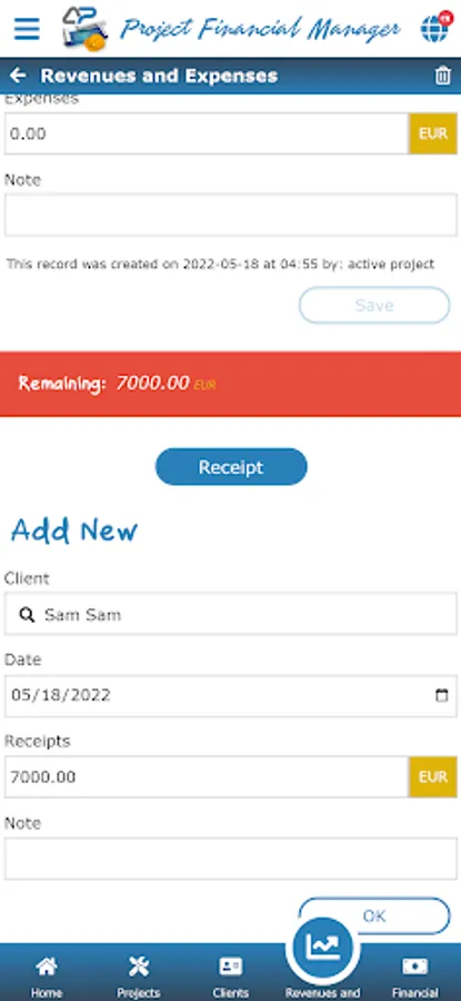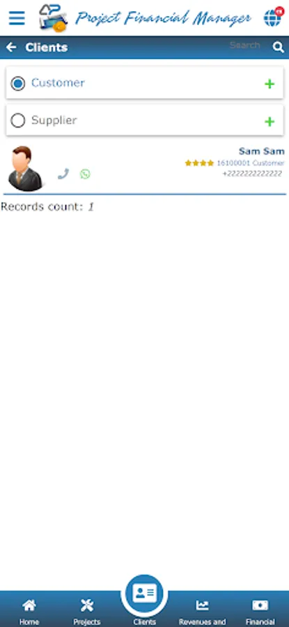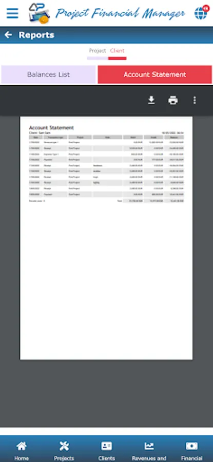 Create a financial transactions and get a statement of customers and suppliers for each project.