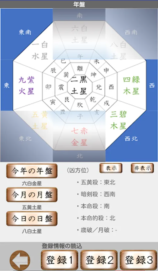 今日の年盤,月盤,日盤を見ることができます。また、凶方位の確認ができます。