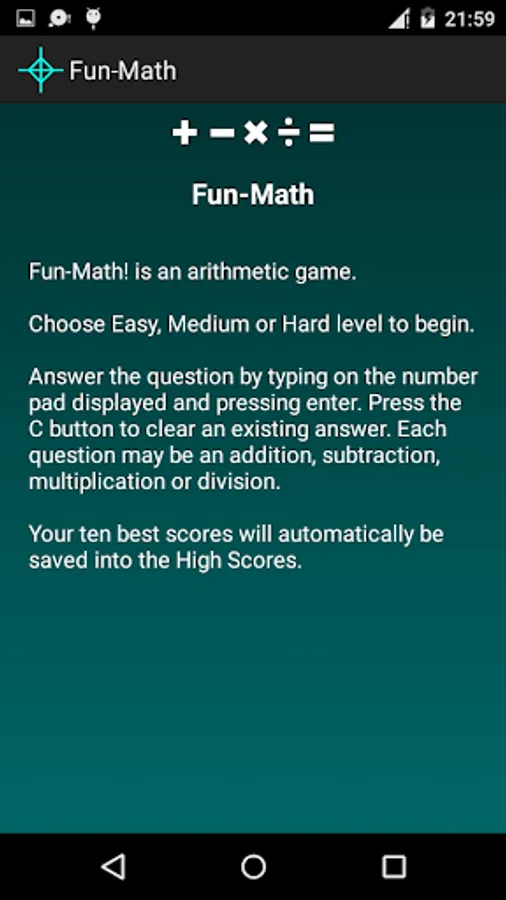 Fun-Math application is for everyone to play around with the mathematics operations of addition, subtraction, multiplication and division.
