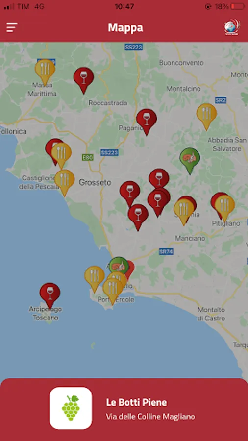 The 'Map' icon on the navigation bar allows you tohave a complete view of the activities on the territory, with their recognition through the identification image of the category to which they belong and immediate access to the dedicated card.