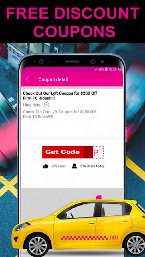 Save big with discount coupons and promo codes for Lyft rideshare. Pay less on your taxi rides with Lyft promo codes and coupons now. Lyft coupon is ready for instant use, and thus instant savings. It does not matter if it is normal ride or share ride, the Lyft promo codes and discounts are all applicable. Find the available taxi nearby your pickup point and get pick up in just few minutes. Drivers are friendly and offer good services. Simply use the Lyft promo codes coupons in the app when you call for the taxi ride. The Lyft coupon discounts will be automatically used for you. You may even get free credits which mean you pay less on your ride or you even ride for free!