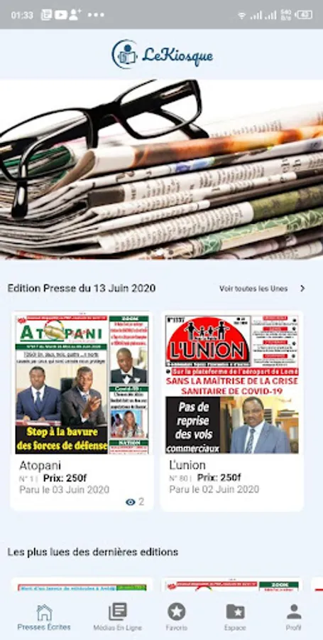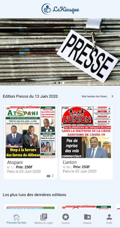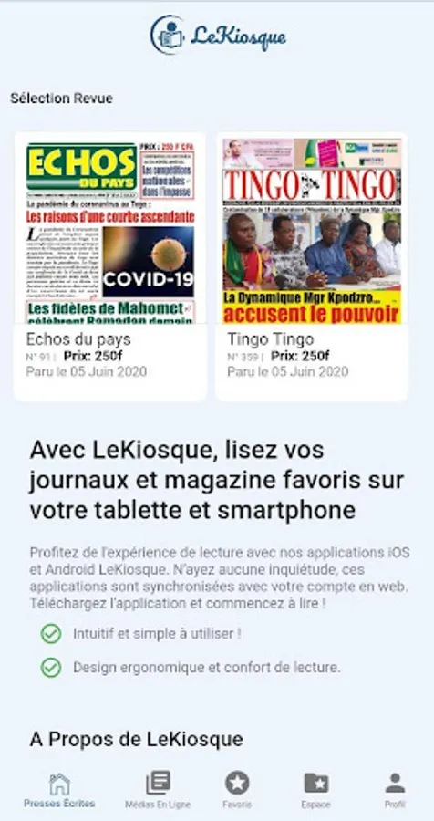 Lekiosque is a digital platform that allows everyone to consult a variety of newspapers, magazines, new productions and online sites, all categories combined on current events in Togo, Africa and the world. It offers the opportunity to search for articles and topics that you are passionate about and even ask for details and details on the news topics that grab your attention, to share the information acquired with your friends, colleagues, family, to buy products and store all your favorite newspapers and magazines. You are free to follow political, sporting, economic, cultural news and more, according to your desires and centers of interest.