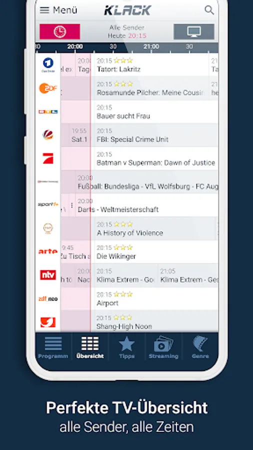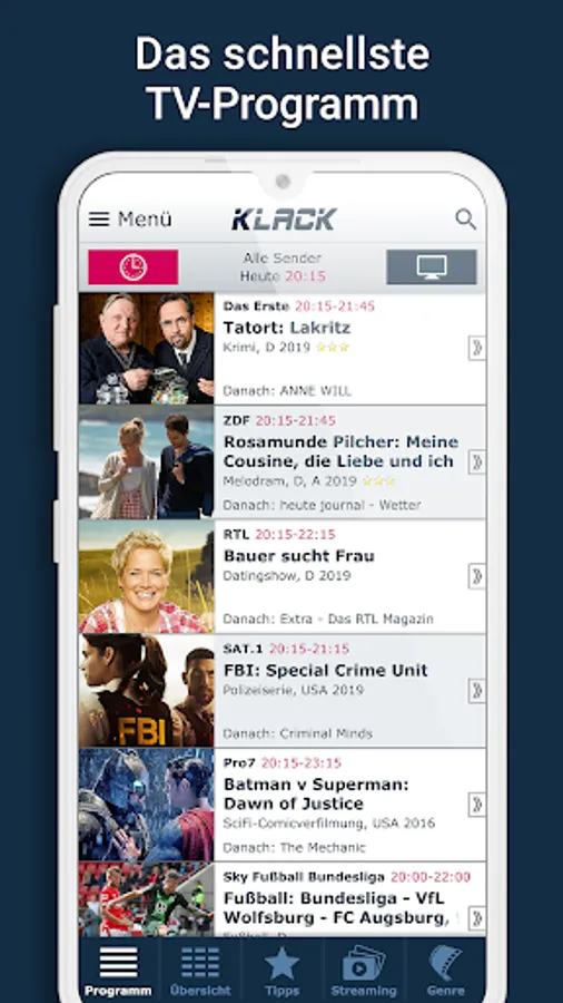 We are constantly working to ensure that you can really check all TV programs using the KLACK TV Guide. We want you to see every TV movie, all Hollywood movies, sports, thrillers, comedies and series at a glance. KLACK offers the program from ARD, ZDF, RTL, Sat1, Pro7, RTL II, VOX, Kabel 1, 3sat, Super RTL, WDR, NDR, Pro7 MAXX, Servus TV, N24, Tagesschau24, Sonnenklar TV, ORF, Sky Fußball Bundesliga & many more. Best overview - watch TV relaxed!