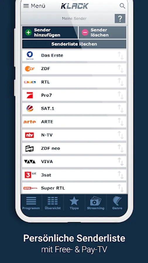With a login in the KLACK app, your personal station lists are taken over by klack.de. So you have your personal TV program directly on your mobile phone and can navigate faster than with TV Movie, TV Spielfilm or TV Today.