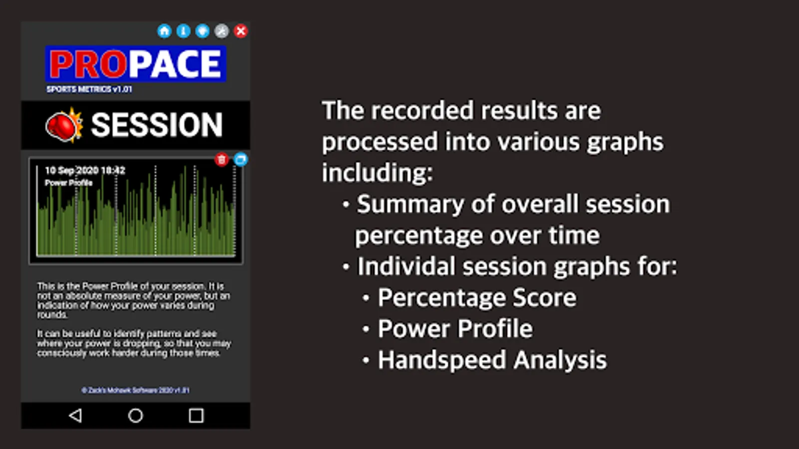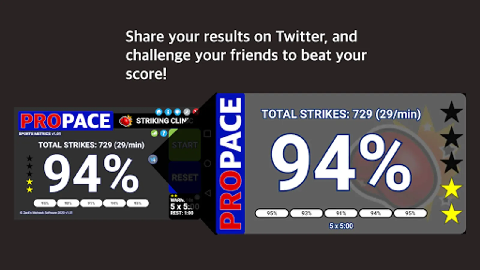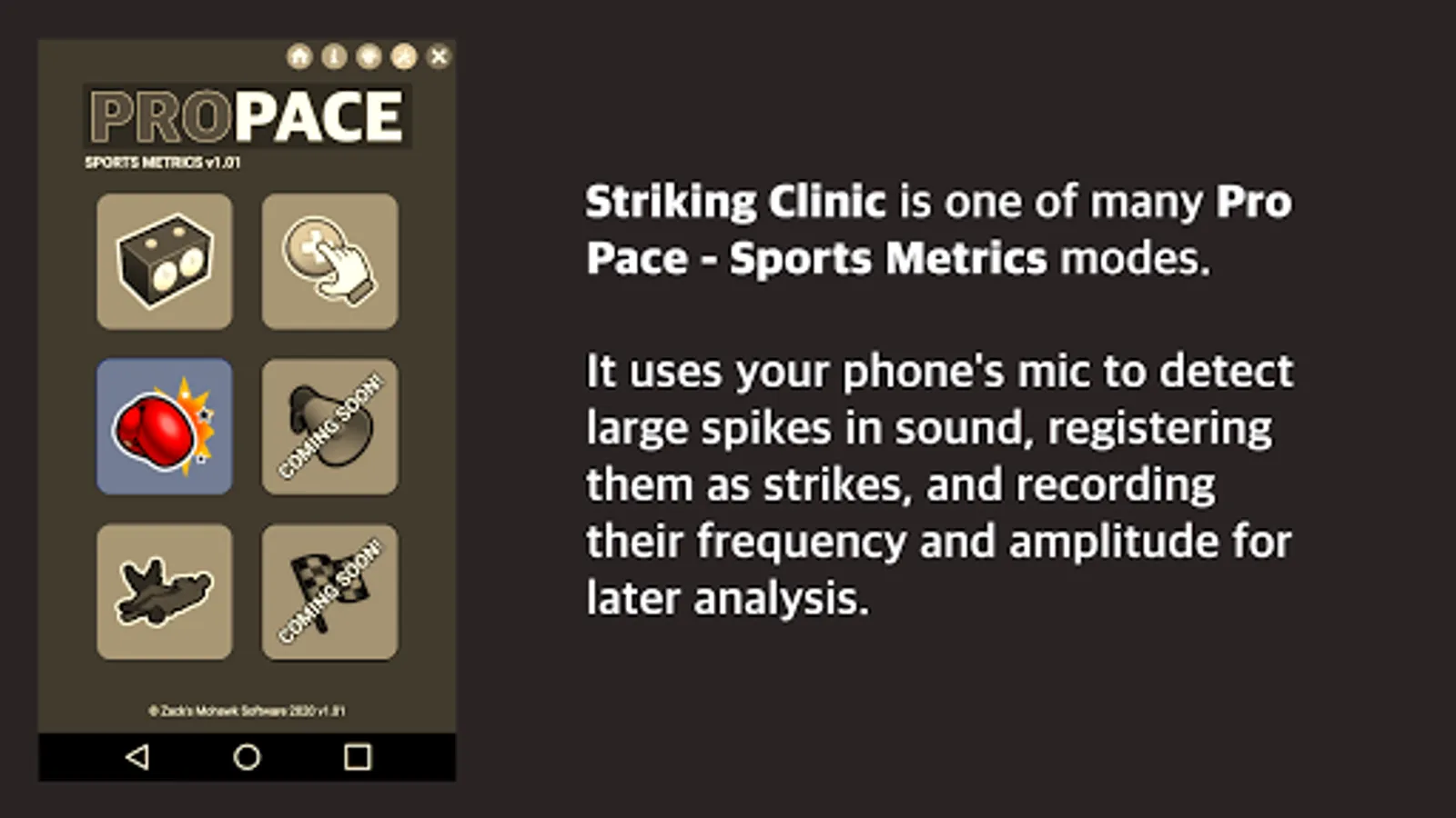 Striking Clinic is our flagship feature, which drives your boxing/muay thai/etc. output by emitting a beep when your next strike is about to be overdue. It records the frequency and amplitude of your shots also, in order to produce graphs of performance (power profile, hand speed, etc.) that can be used to understand progress over time. NOTE: This is available in trial mode initially, and requires a small in-app purchase to unlock the full features.