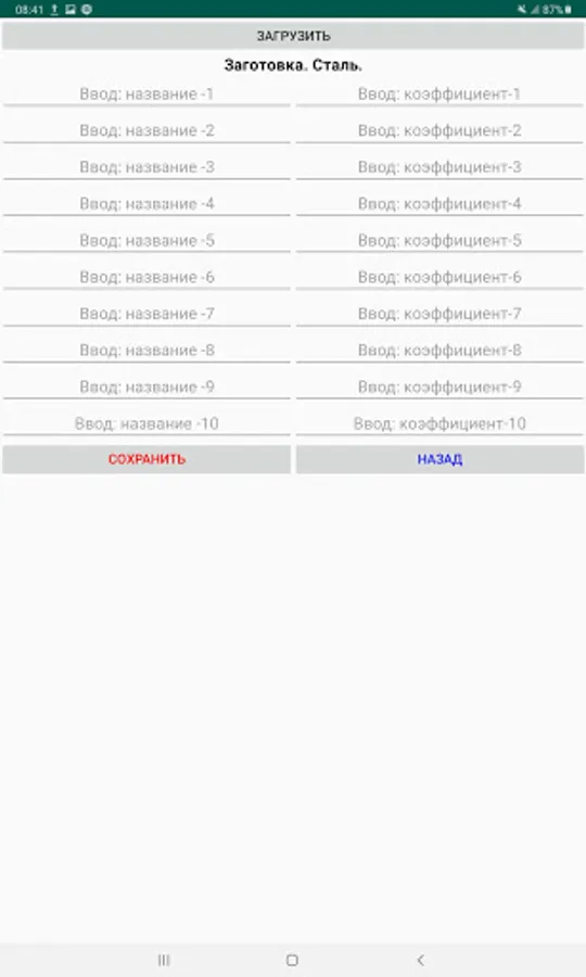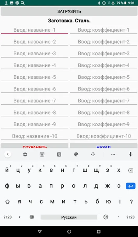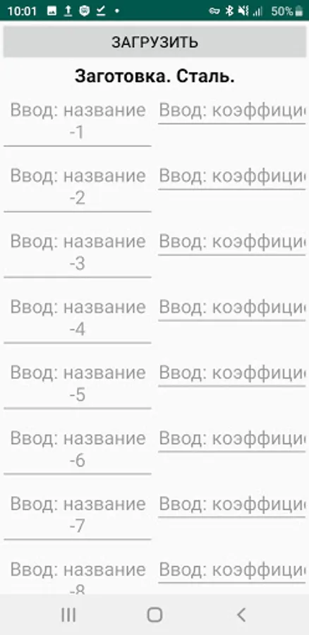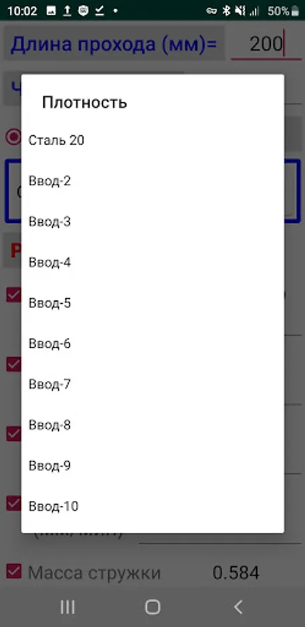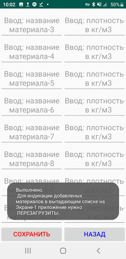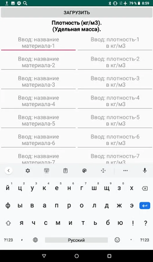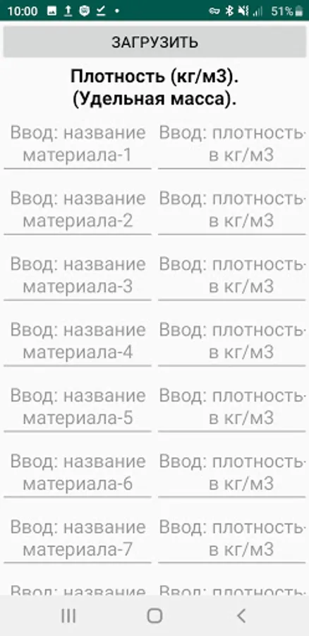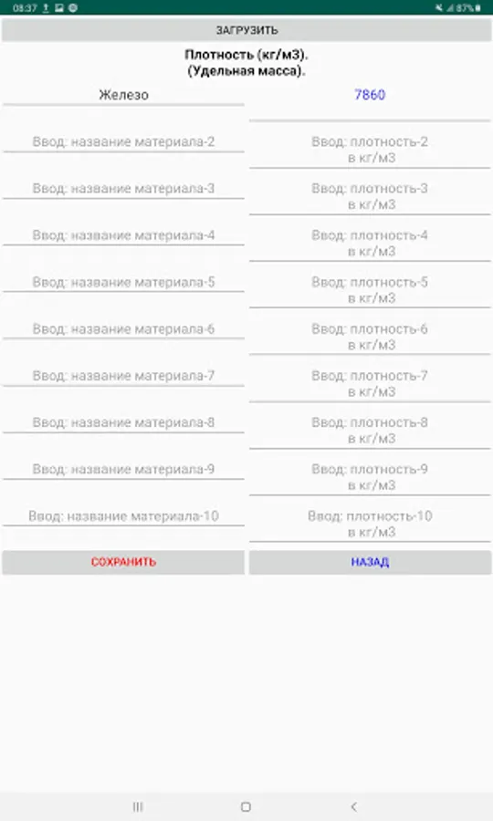 On screen-1, click the [Density] button and enter the name of the material into the table in the left column and the numerical value in the right one.