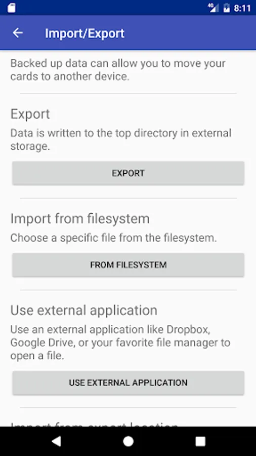The application requires very few permissions, and never attempts to access the Internet. There is an option to backup your cards to local storage. From there you can send the backup somewhere safe.