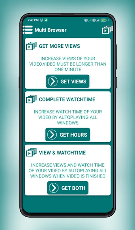 multi watch time browser for android autoplay videos in 10 windows, multi watch time browser increase views by watching 10 windows browser.