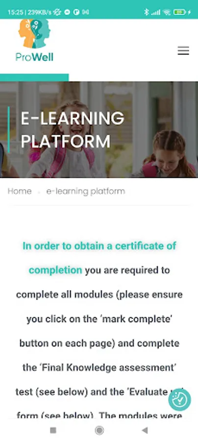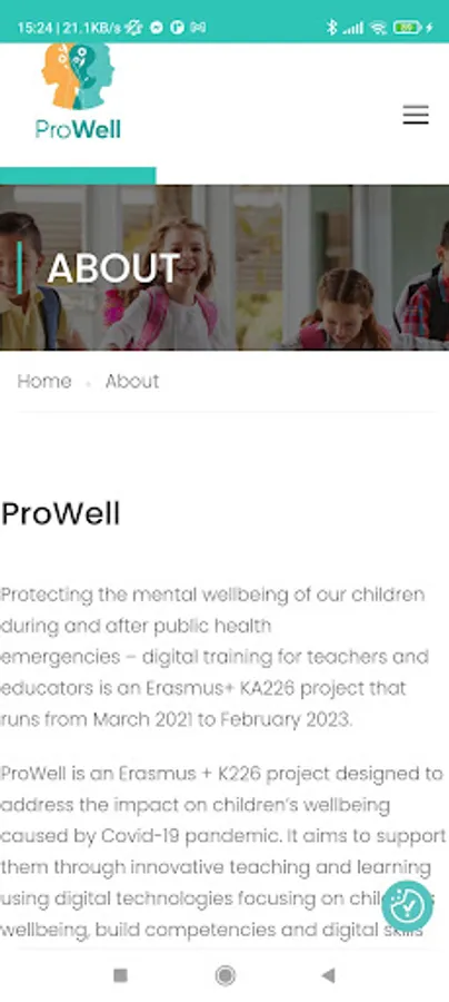 The Pro-WELL training platform and digital learning tools is a crucial output core to the project which through the consortium aimed to improve digital skills of teachers and educators so as to improve their ability to promote mental health of children during and after pandemics and other public health emergencies. We designed and developed an interactive e-learning platform, so as to increase the sustainability of the project training package by making it easily accessible to all interested parties. The e-learning platform, developed with the active participation of the consortium members, can be used as a virtual learning environment. Through the platform users are able to access the developed training modules, material and tools, participate in learning activities and use assessment tools to evaluate their performance as well as communicate with other learners and instructors, as the platform can also be a central point for exchange of information and ideas. All resources and educational material are open and free for any interested party, enhancing the output's impact and making it accessible to participants with fewer opportunities. The platform also supports a digital resources data base, multimedia content and interactive infographics. Central elements of the platform are the communication and networking tools it supports, where members are able to register their profiles and identify other peers, creating on-line communities of practice. This mobile application was developed based on the project’s platform.