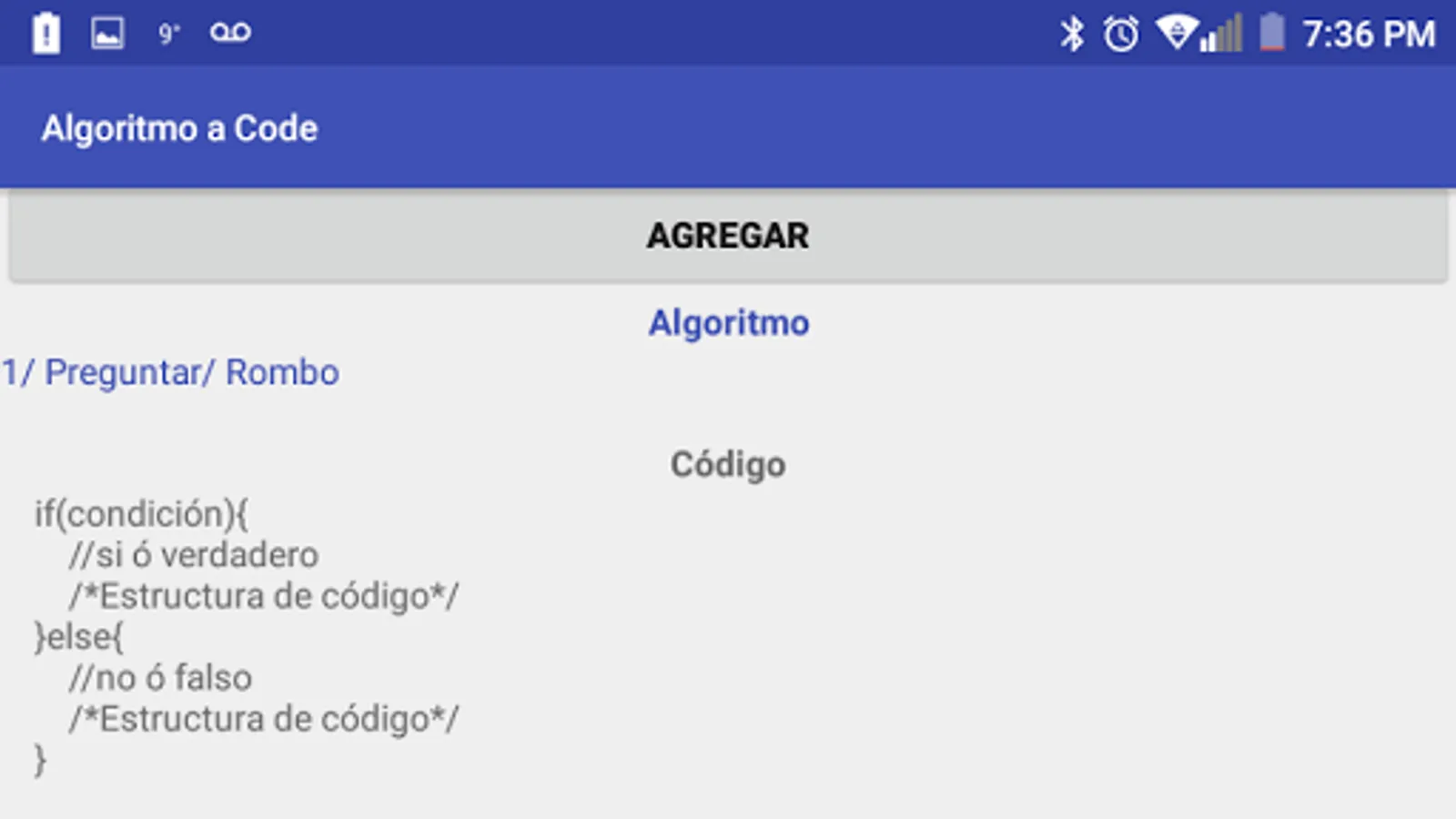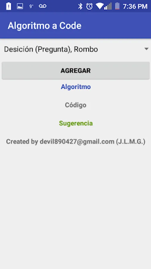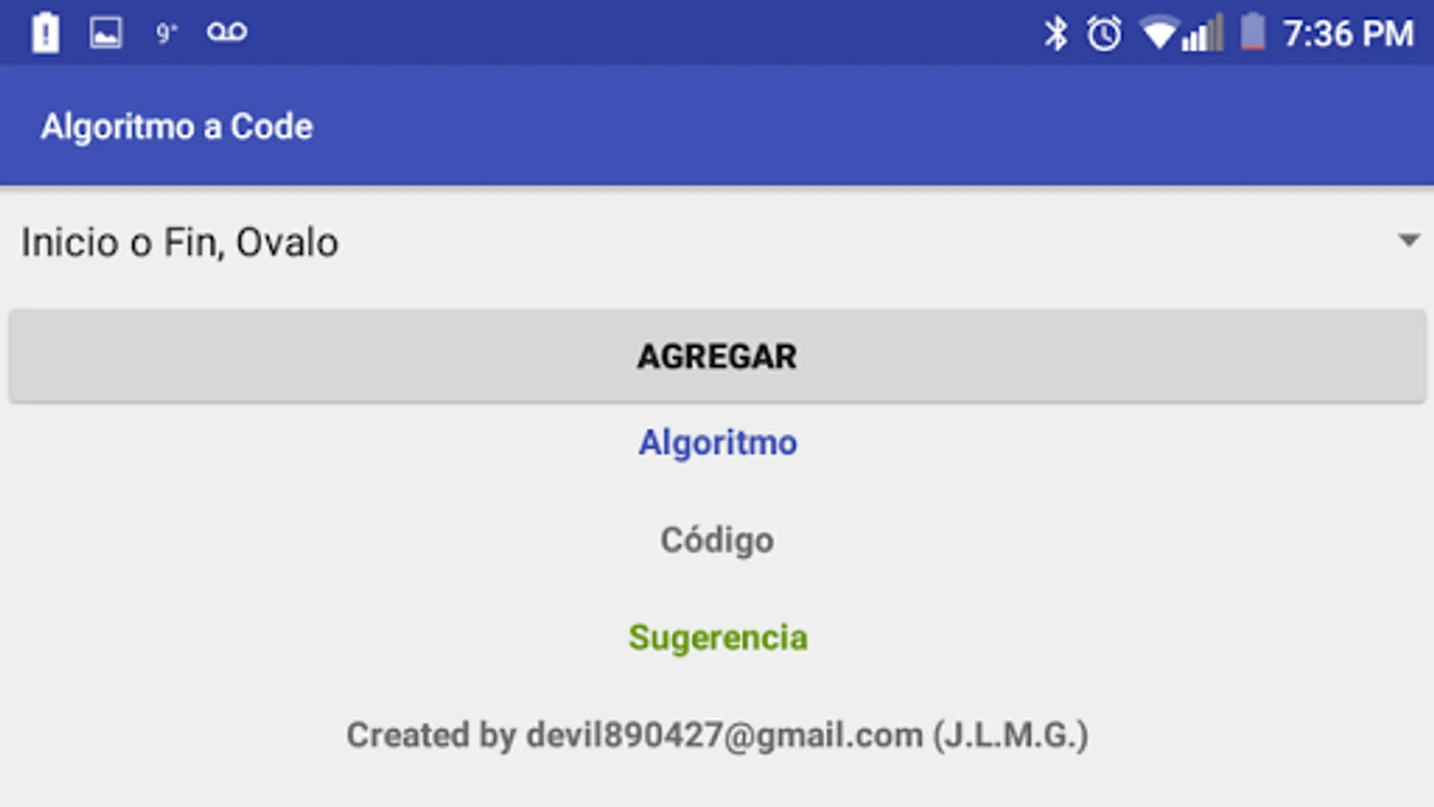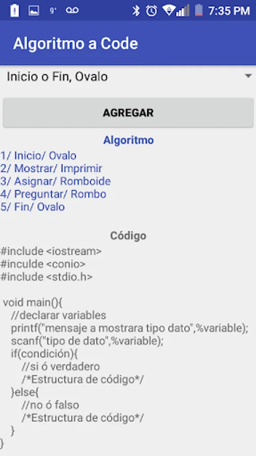 Version 0001 only is to select the different steps to perform an algorithm and when pressed add sample step, pseudocode, the approximate symbol flowchart in another section the approximate code shown in language c ++ and finally in another section some recommendations that can be followed is.