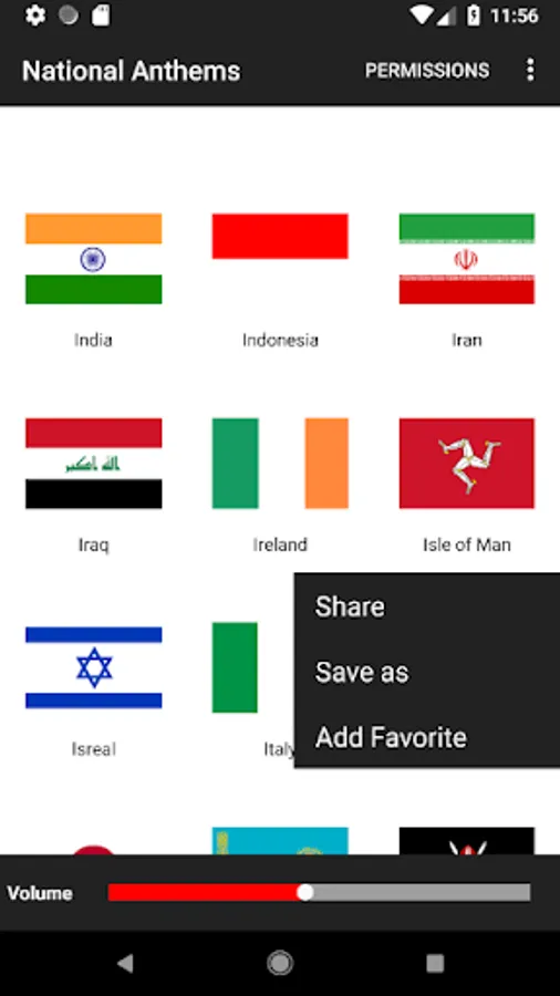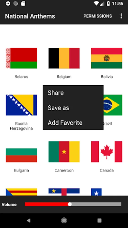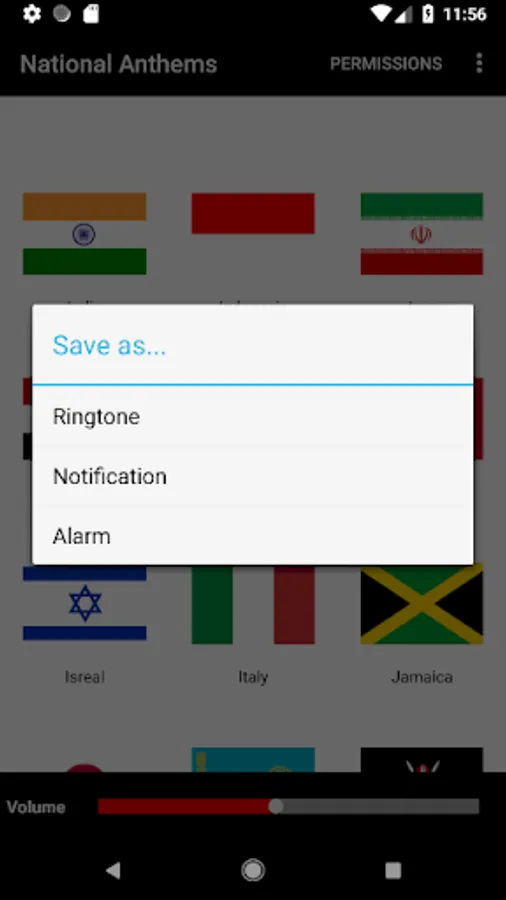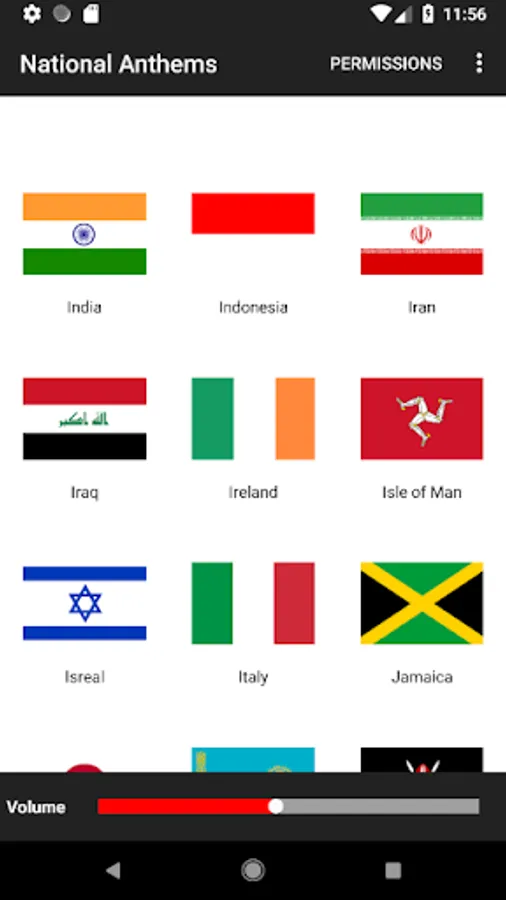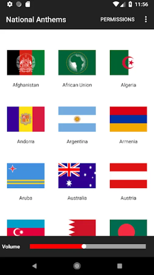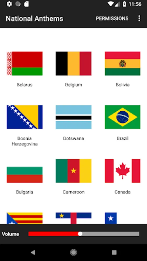 This National Anthem application for your mobile device features over 130 different national anthems! Have you forgot what your national anthem sounds like, or are you just curious what national anthems the different countries all over the world have, you can find out in this app! Save them as ringtone, alarm or just as a normal sound, share them with friends, and make everyone around your hear your national pride!