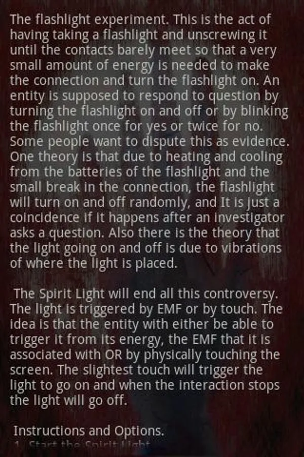 The flashlight experiment. This is the act of having taking a flashlight and unscrewing it until the contacts barely meet so that a very small amount of energy is needed to make the connection and turn the flashlight on. An entity is supposed to respond to question by turning the flashlight on and off or by blinking the flashlight once for yes or twice for no. Some people want to dispute this as evidence. Three theories are that due to heating and cooling from the batteries of the flashlight and the small break in the connection, the flashlight will turn on and off randomly, and It is just a coincidence if it happens after an investigator asks a question. Another is there is that the light going on and off is due to vibrations due to where the light is placed. Lastly this theory is called "arcing" it is where the connections will be so close together, it will cause a small arc of electricity from time to time, thus causing the flashlight to go on and off.