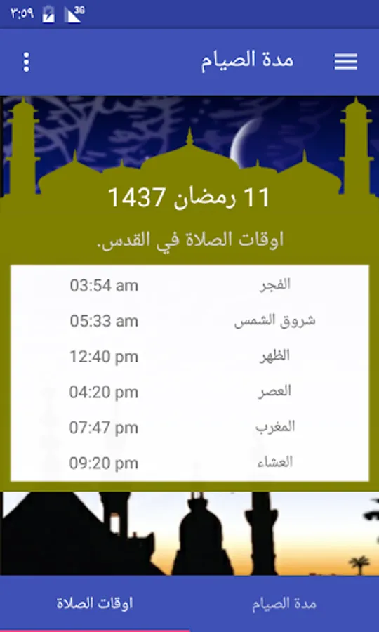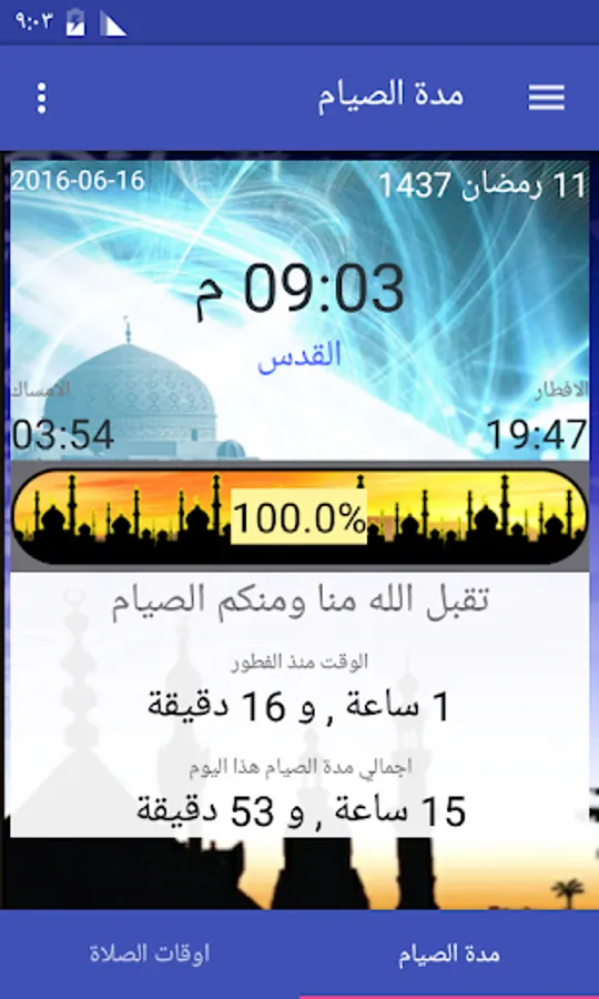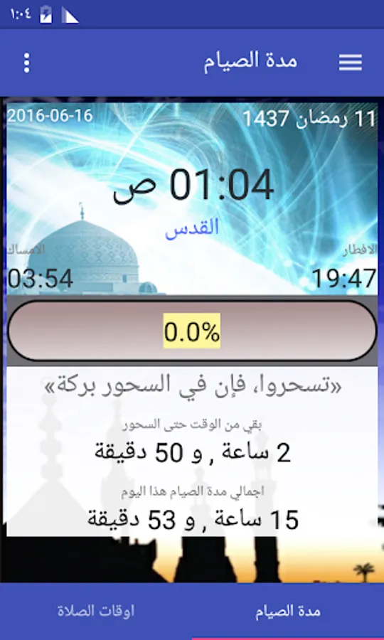 احصل على اوقات دقيقة حول مدة الصوم , والوقت المتبقي حتى الافطار اوكم صمت حتى الان , التطبيق ايضا يقدم اوقات الصلاة