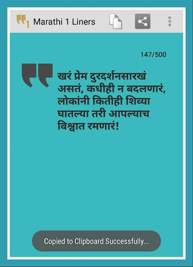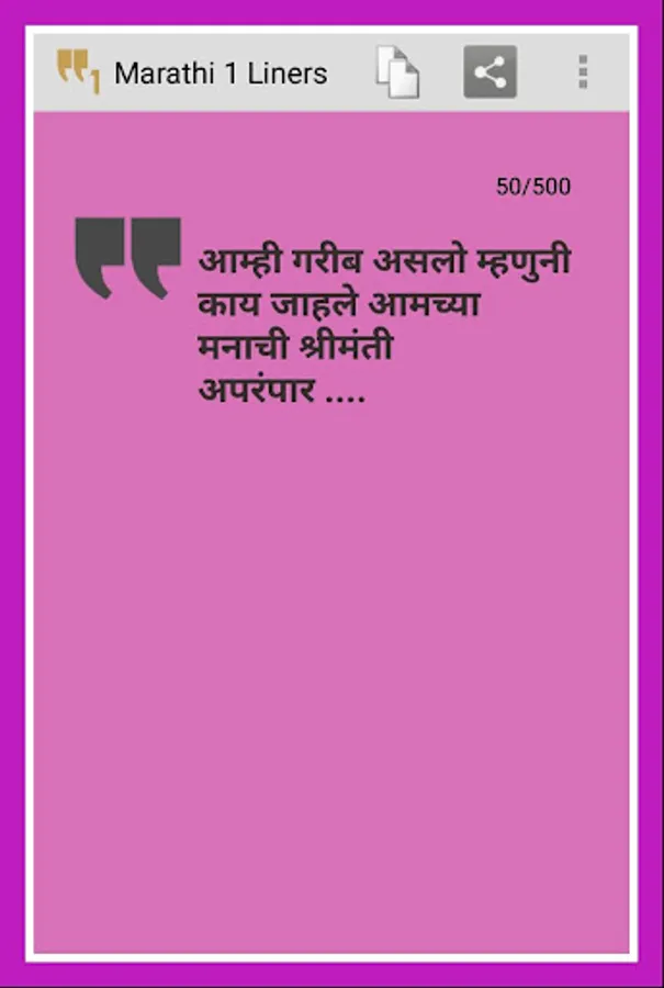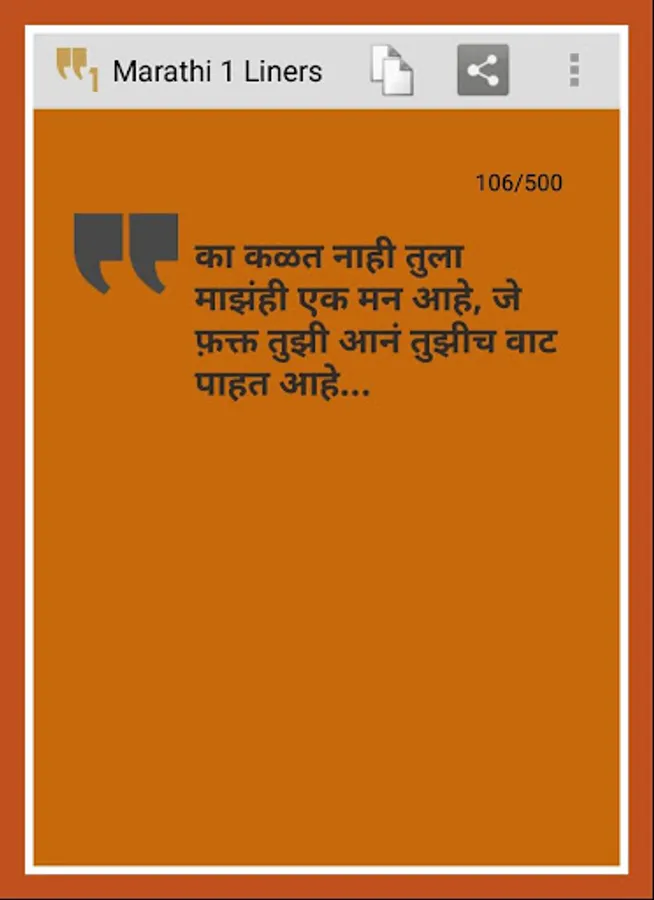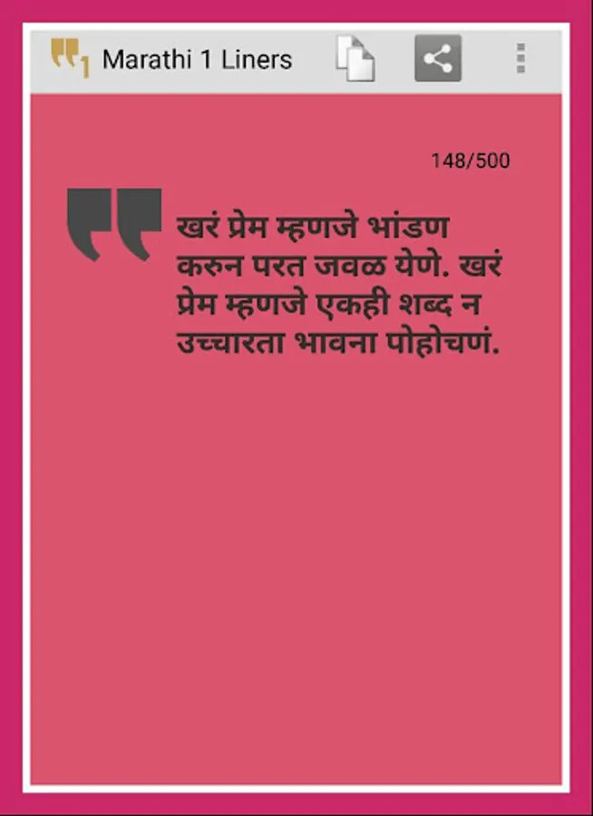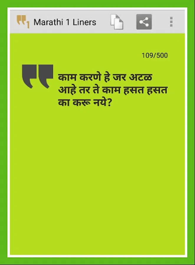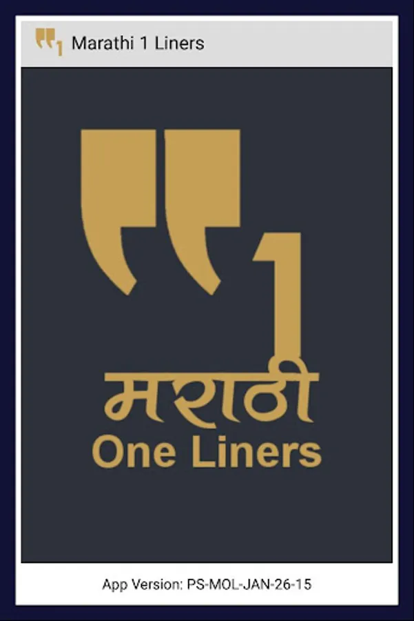 This App Contains 500 Famous Marathi One Liners, Funny and Love Quotes, Dialogues etc. which you can use to set your status.