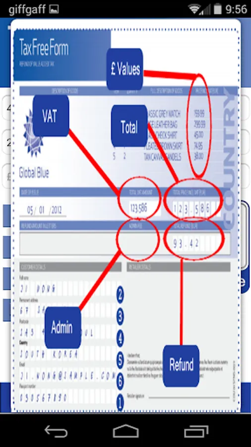 Completing Vat refund forms for shoppers who are from outside the EU can be complex, the app will add up the cost of the items and automatically calculate Vat, Admin fee and Refund amount.