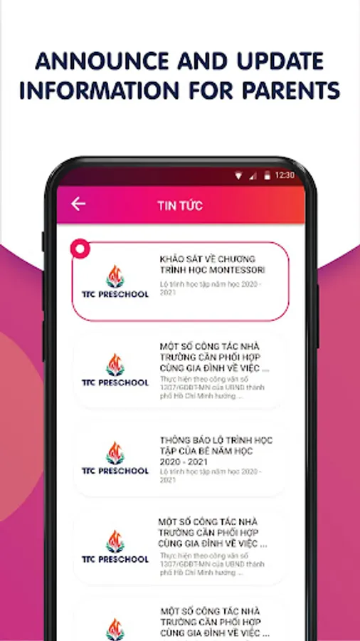 Application connecting parents to our school in care and education of children, which allows parents to: