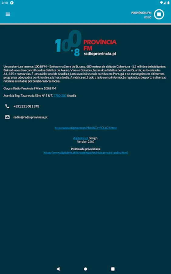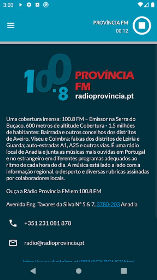An immense coverage: 100.8 FM - Broadcaster in Buçaco Mountain, 600 meters altitude Coverage - 1.5 million inhabitants: Bairrada and other municipalities of the districts of Aveiro, Viseu and Coimbra; groups of districts of Leiria and Guard; motorways A1, A25 and other routes. It is a local radio Anadia and joins the most heard songs in Portugal and abroad in different pace appropriate to each hour of the day programs. The music goes hand in hand with regional information, sport and various items signed by local collaborators.