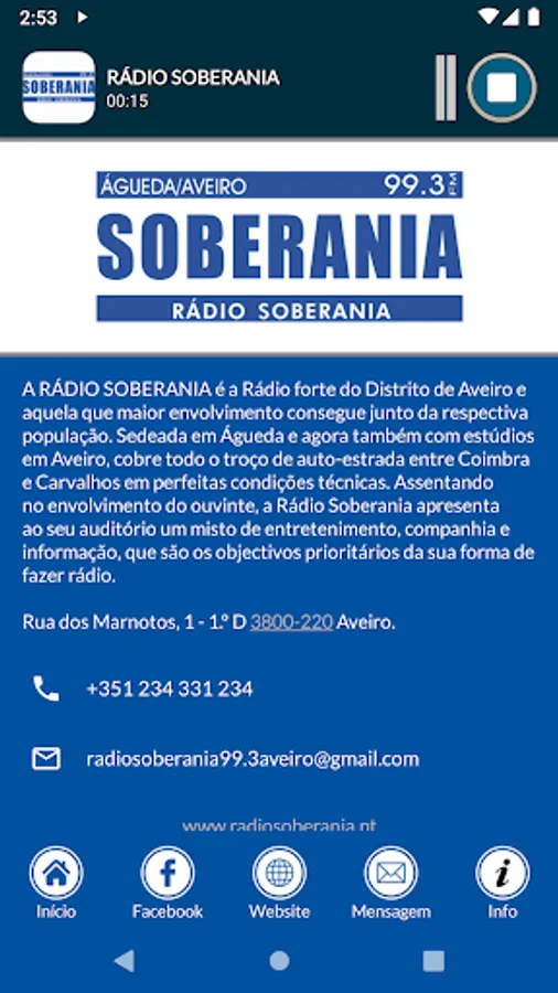 RÁDIO SOBERANIA is the strongest radio in the District of Aveiro and the one that gets the most involvement with the respective population. Based in Águeda and now also with studios in Aveiro, it covers the entire section of motorway between Coimbra and Carvalhos in perfect technical conditions. Based on the involvement of the listener, Rádio Soberania presents to its auditorium a mix of entertainment, company and information, which are the priority objectives of its way of making radio.