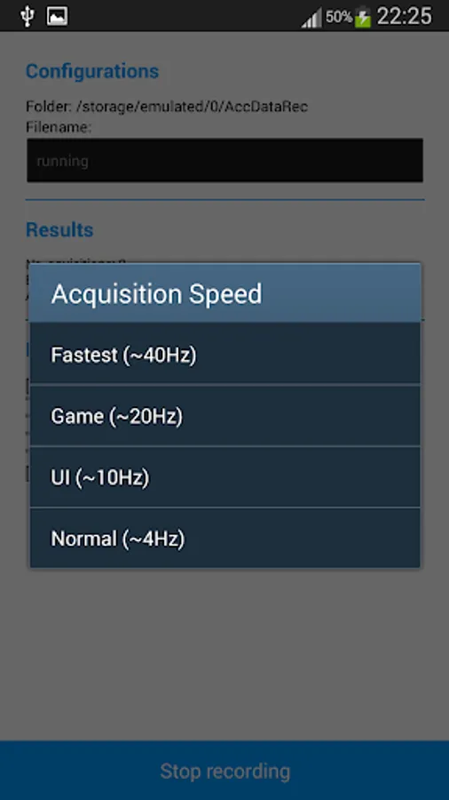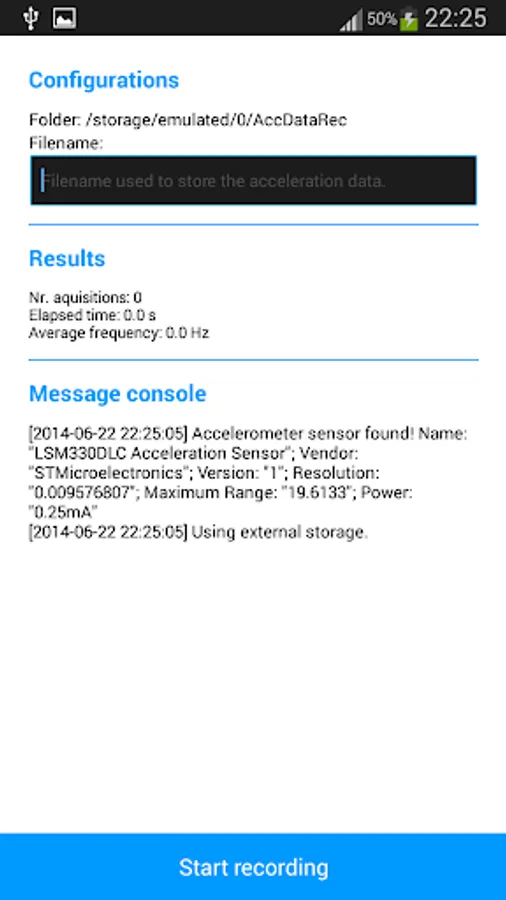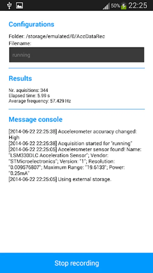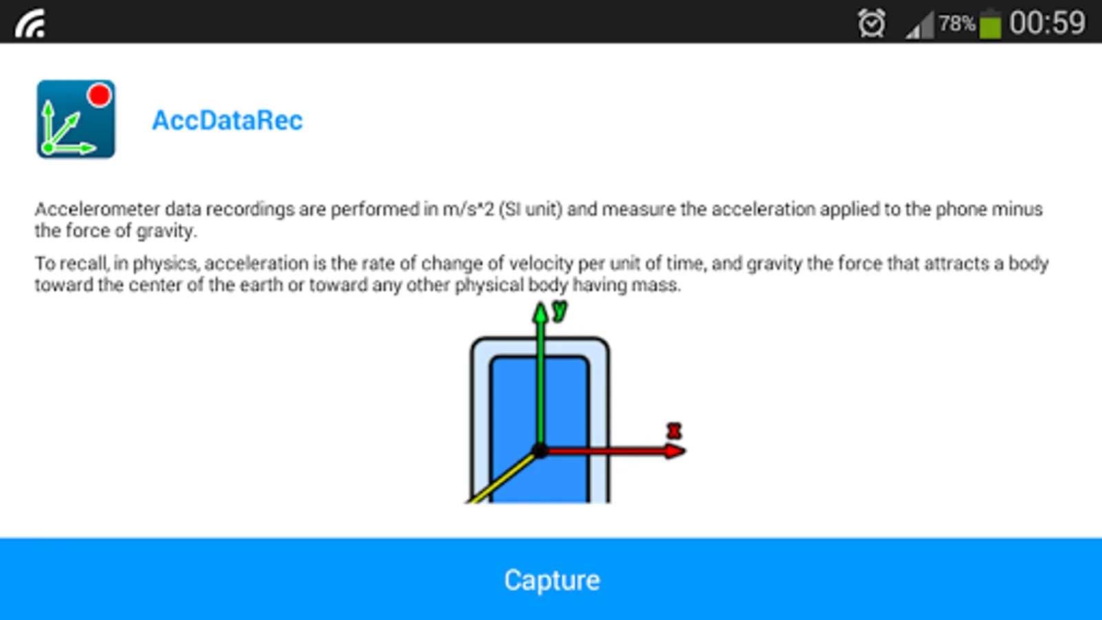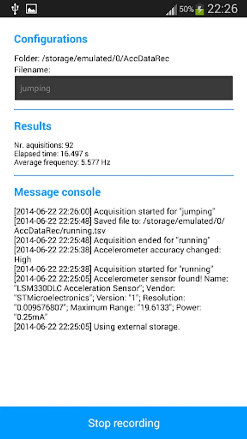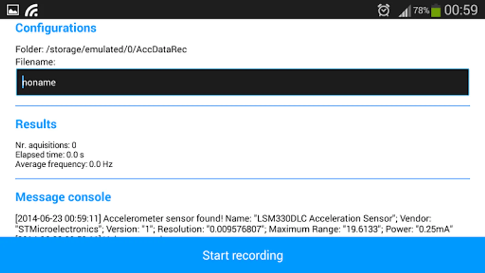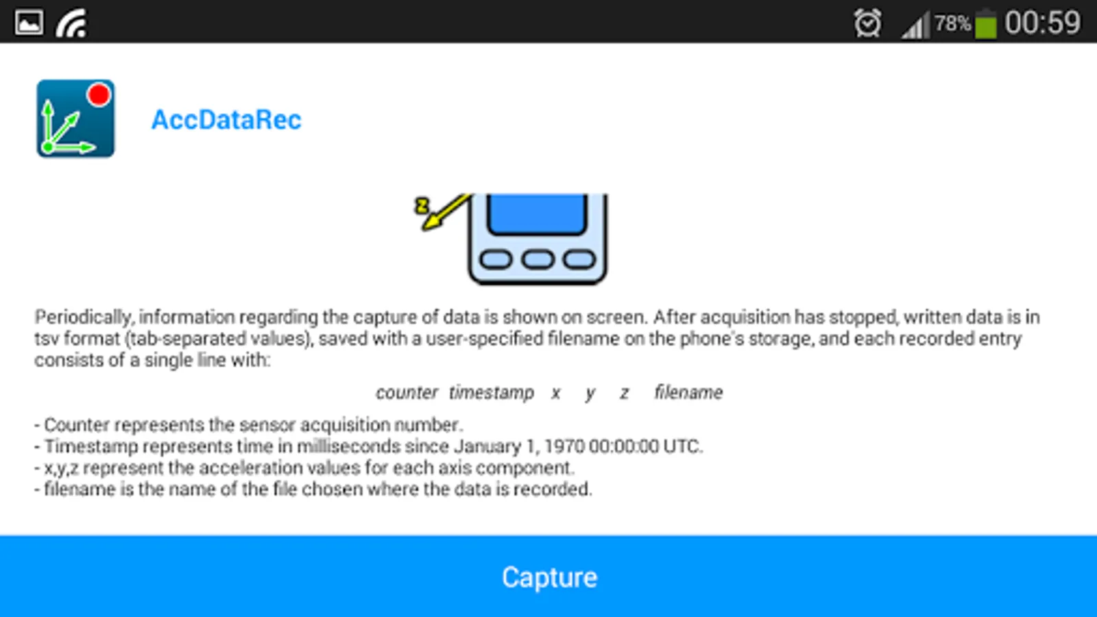 AccDataRec is an application that records accelerometer data (x, y, z components) in m/s^2 (SI unit) to the device's memory storage. When the data capture finishes, written data is in TSV (tab-separated values) format, saved with a user specified filename and consisting of: "counter t timestamp t x t y t z t filename n". Periodically, acceleration data is written to avoid data loss.