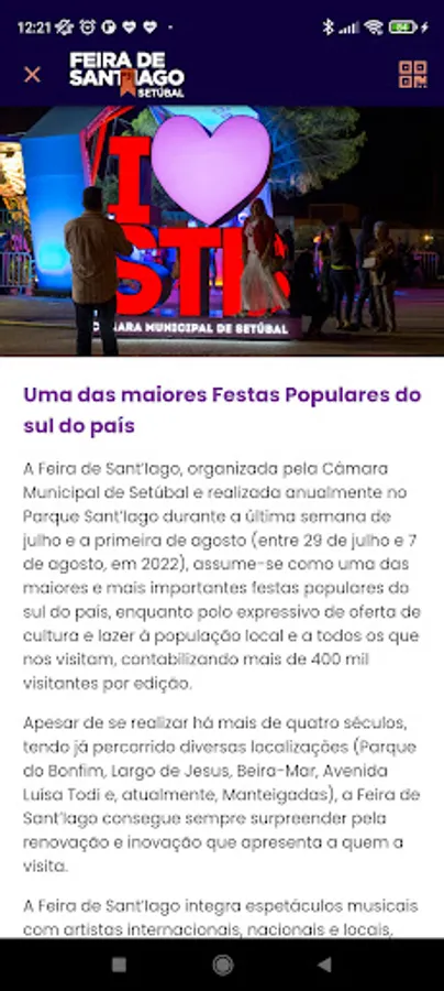 The Feira de Sant'Iago, organized by the Municipality of Setúbal and held annually in Parque Sant'Iago during the last week of July and the first of August, is one of the largest and most important popular festivals in the south of the country, as an expressive center for offering culture and leisure to the local population and to all those who visit us, accounting for more than 400 thousand visitors per edition.