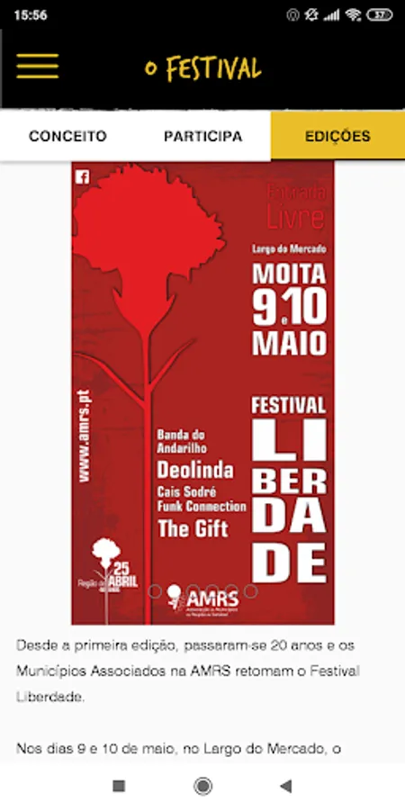 The Festival Liberdade is a Regional Project, assumed by the Association of Municipalities of Setúbal Region and the associated municipalities (Alcácer do Sal, Alcochete, Almada, Barreiro, Moita, Montijo, Palmela, Santiago do Cacém, Seixal, Sesimbra and Setúbal), in partnership with the Youth Associative Movement of the Region, which aims to create spaces for discussion and participation of Youth Structures (formal or non-formal), in a vision of hope and trust that in the transforming capacity of which Youth is a natural carrier.