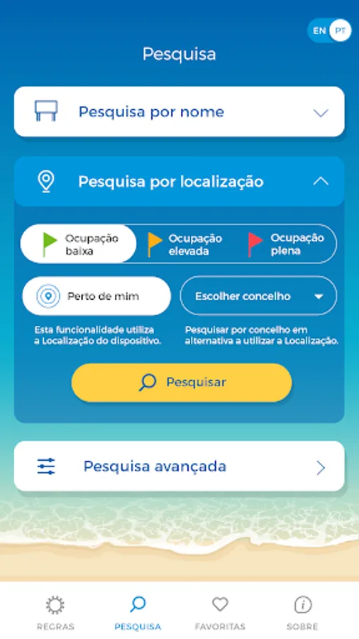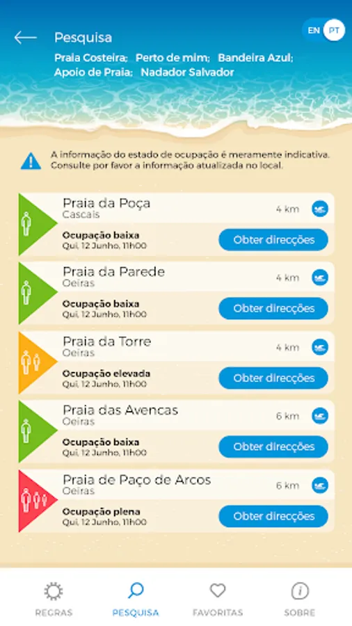 Select in the app the beaches with low occupancy, guarded, with good quality and other important conditions for you.
