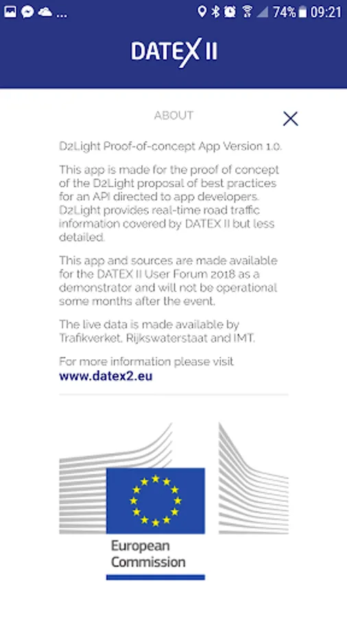This app and D2Light are created by the DATEX II organization which is co-funded by EC/DG-MOVE.