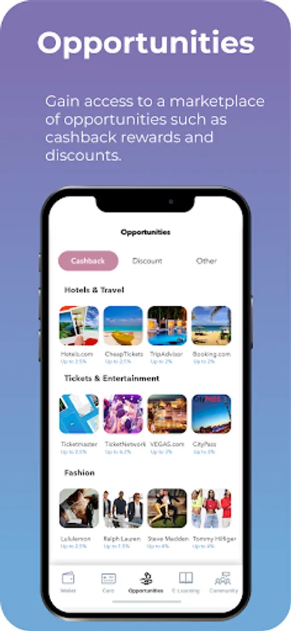 Gain access to a marketplace of opportunities that provides such as cashback and discounts that may be saved or invested.