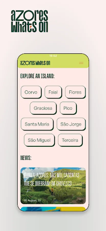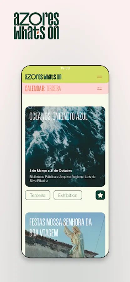 The most complete agenda of events of the Azores with all the info about what’s happening in the Archipelago. For locals and visitors alike, here you can find all the information about theater, cinema, music, sports, exhibitions, ludic and family activities, religious, scientific or themed events as well as all kinds of festivities happening in the 9 islands of the Azorean Archipelago.