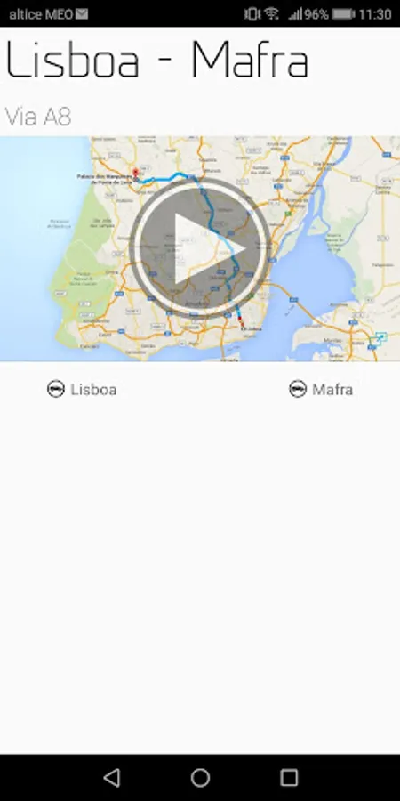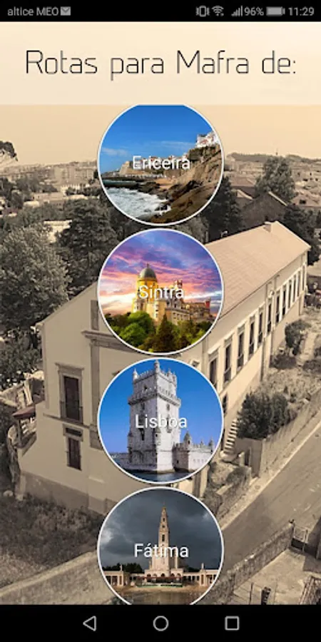 This is an application that allows the user to know the main tourist and historical routes accessible from and to Mafra - Lisbon, Sintra, Ericeira and Fátima (including Óbidos, Alcobaça and Batalha).