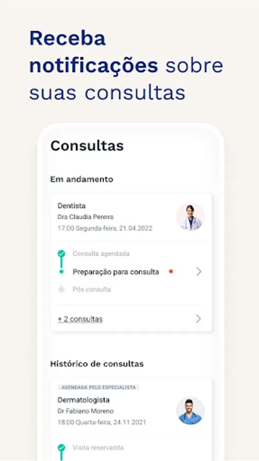 By downloading our app you will have access to more than 22,000 specialists throughout the country and you will be able to schedule medical consultations directly by telemóvil. Filter your search by specialty, city, zip code, treatment, insurance (Allianz, Axa, Cardif, Eurovida, Lusitana etc.) or use the map to find the ideal professional.