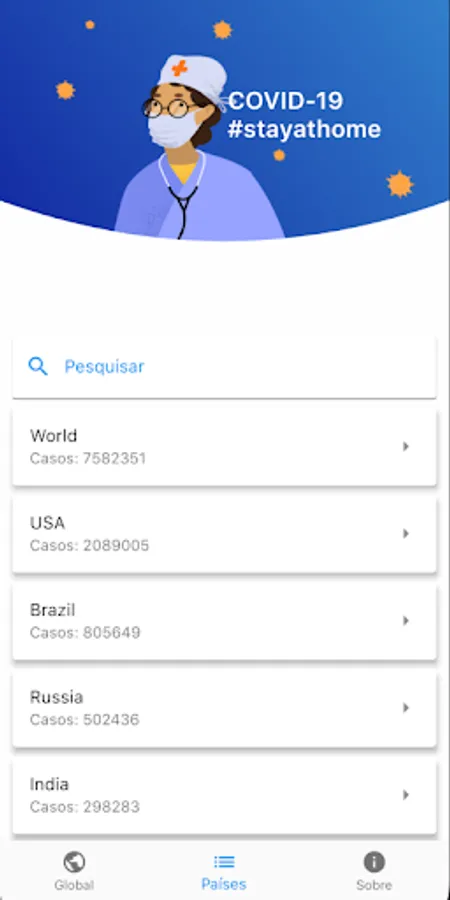 This application was created for entertainment, with the aim of improving my skills as a programmer and providing information updated daily by worldmeters about the current pandemic for the population.