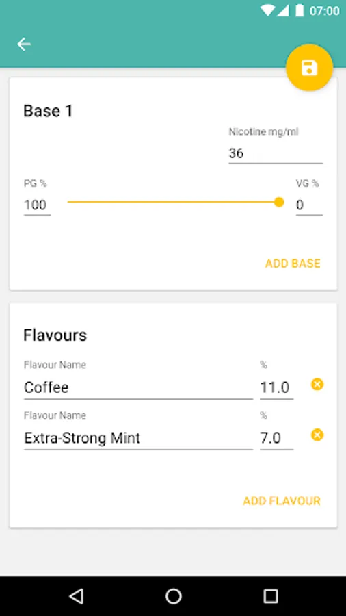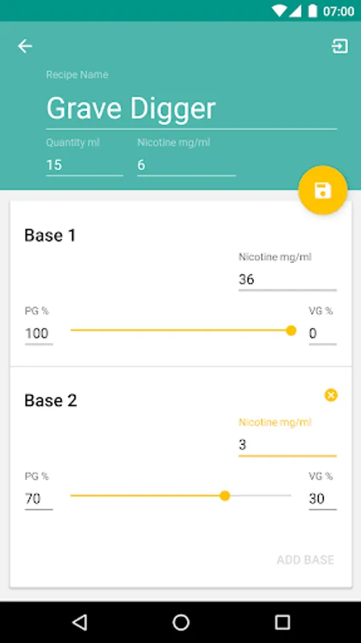 Mixology allows you to create recipes with two nicotine Bases, with different nicotine concentrations, calculating the quantities of each one in order to achieve the target nicotine value.