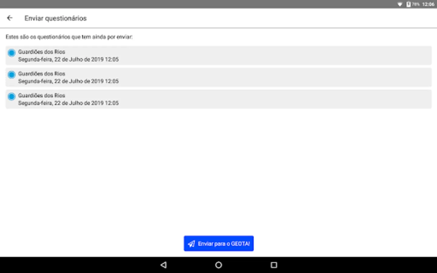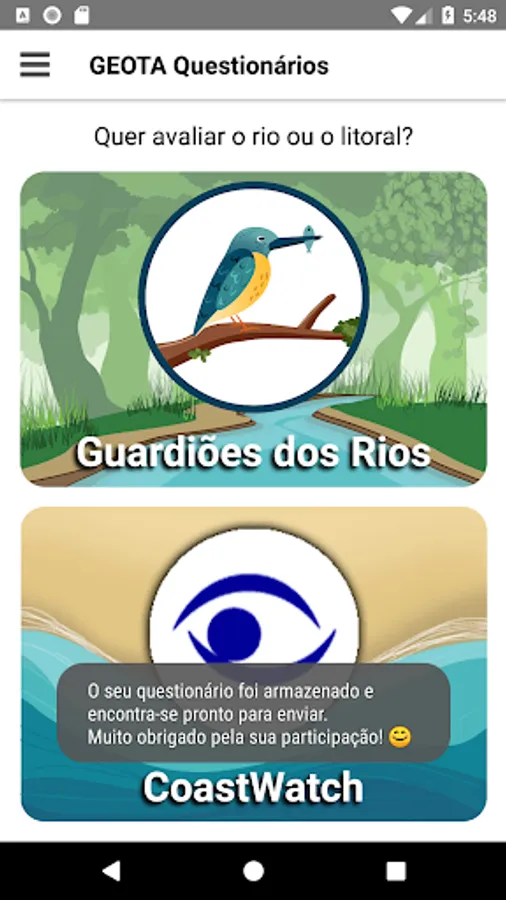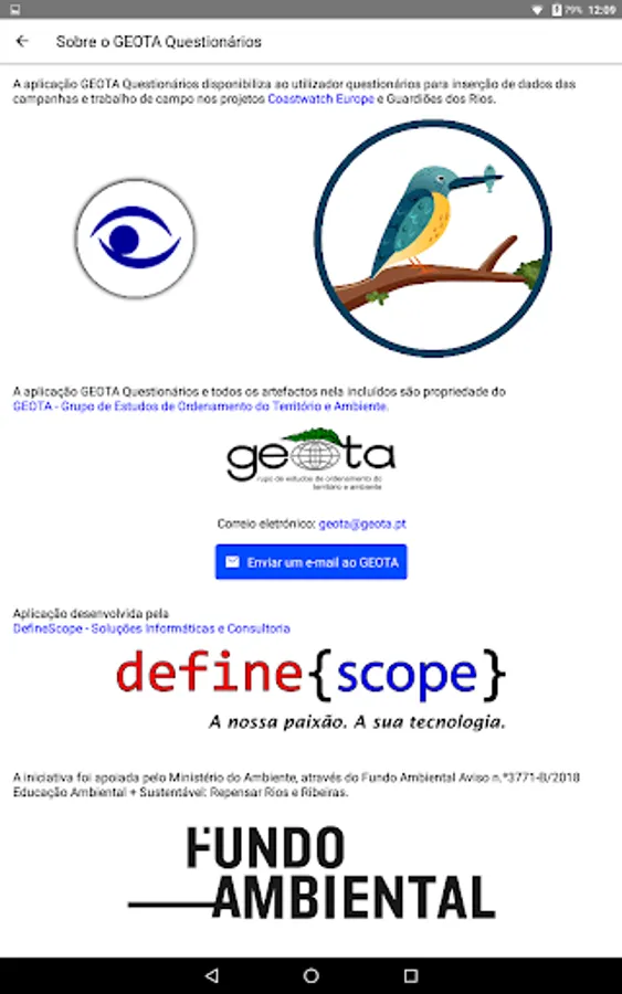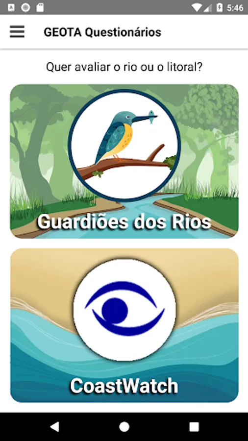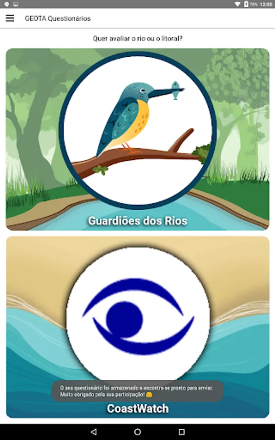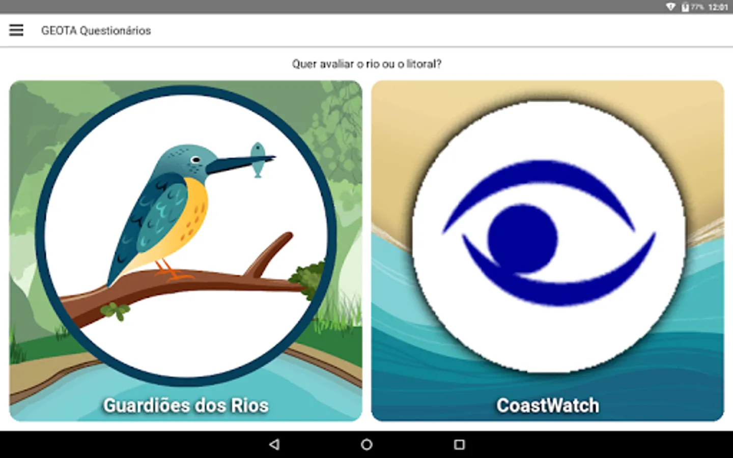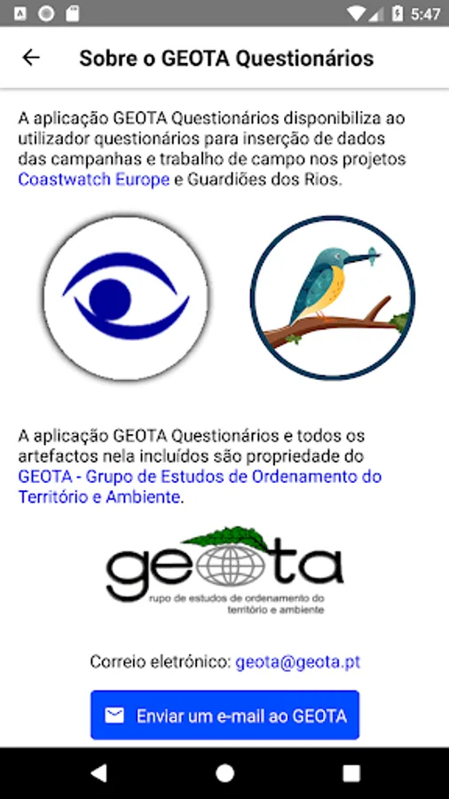 The GEOTA Questionnaires application intends to promote and facilitate participation in two citizen science projects - Coastwatch and Guardians of Rivers - of GEOTA to monitor the coast and Portuguese rivers.