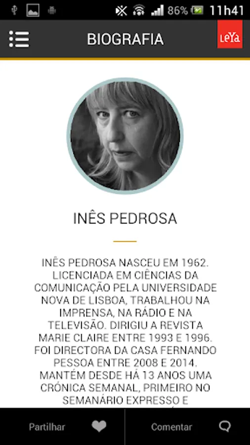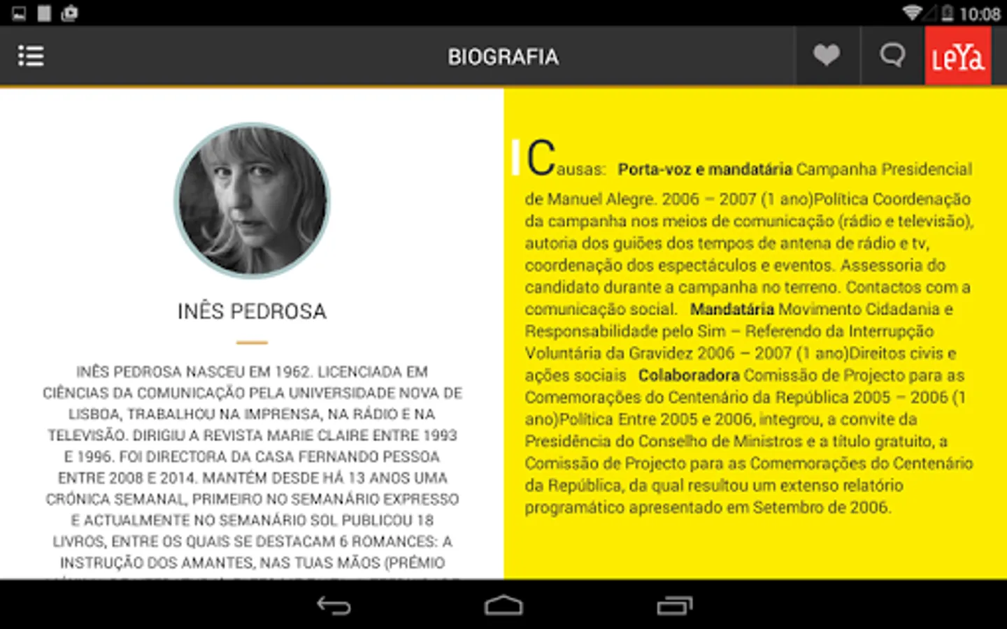The app dedicated to Agnes Pedrosa want to be YOUR app when you want to know the latest news around the author. One where quick and easy access to the publishing catalog, know the latest news and the author and his work and monitors the activity of Ines Pedrosa. In real time you can know how close is Inês Pedrosa him.