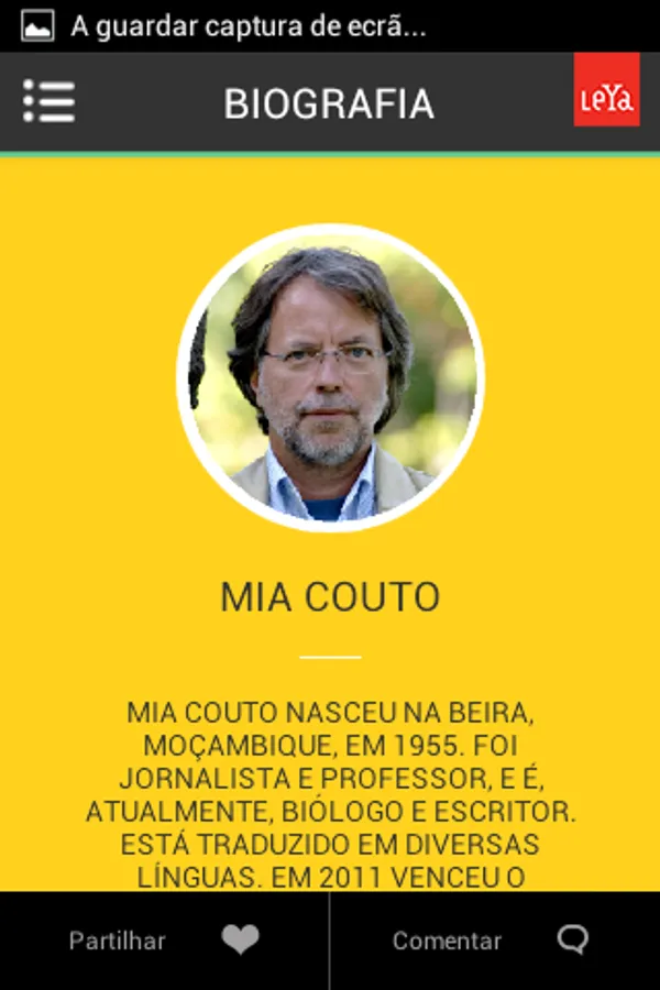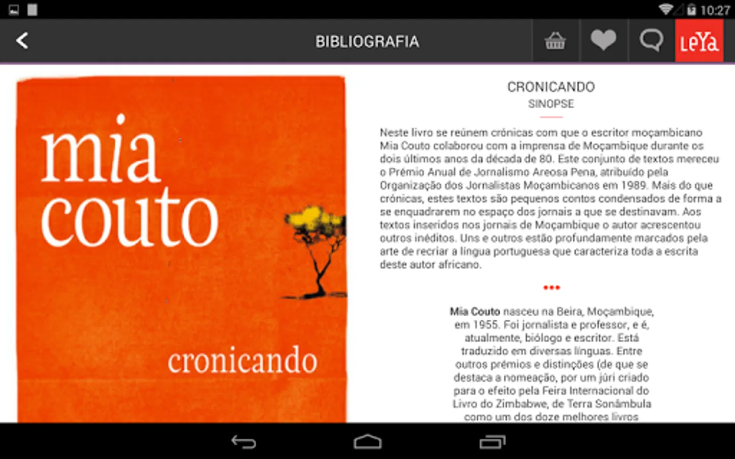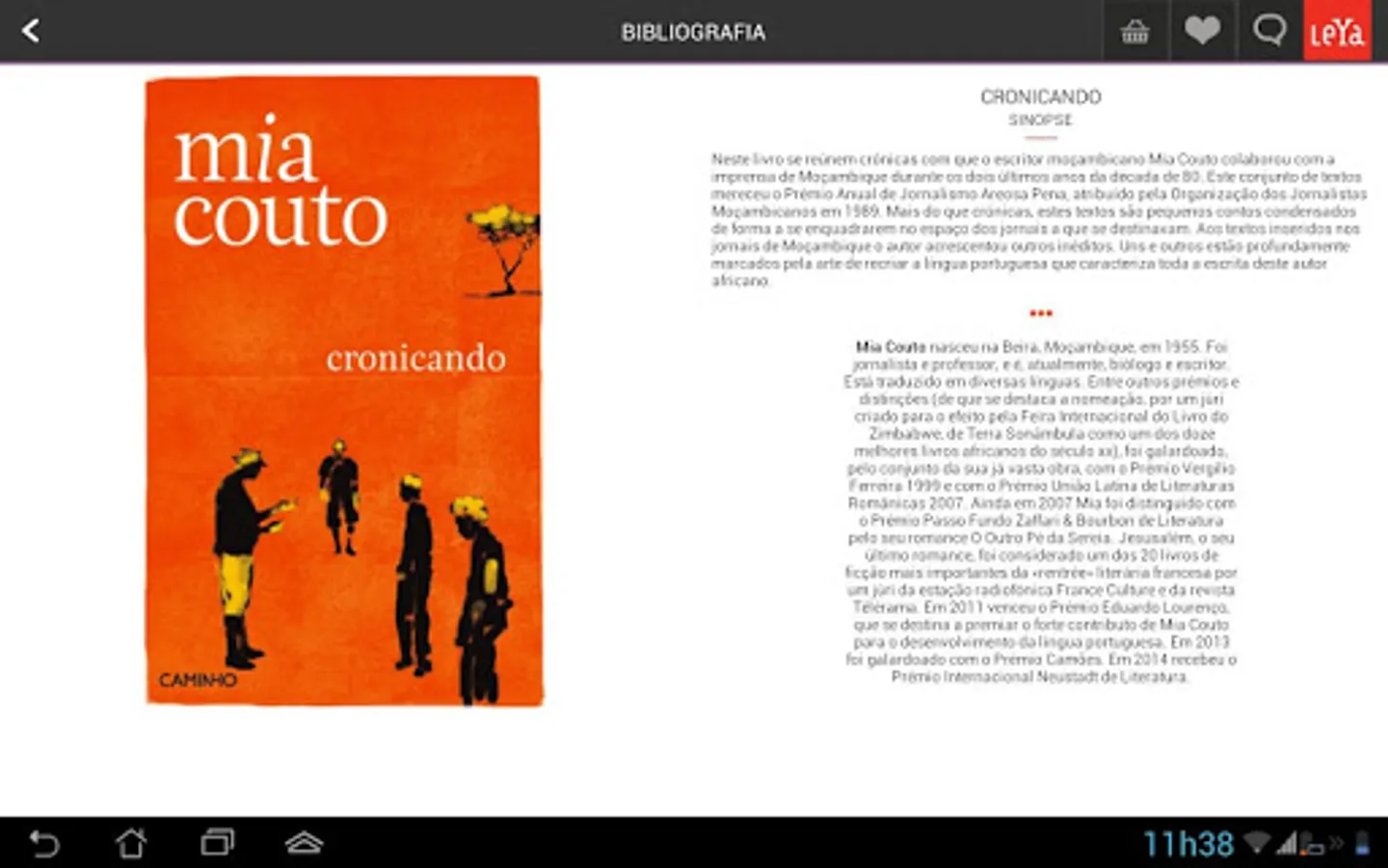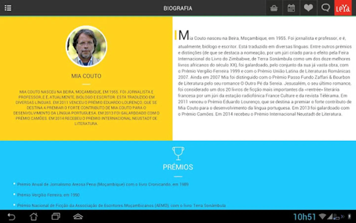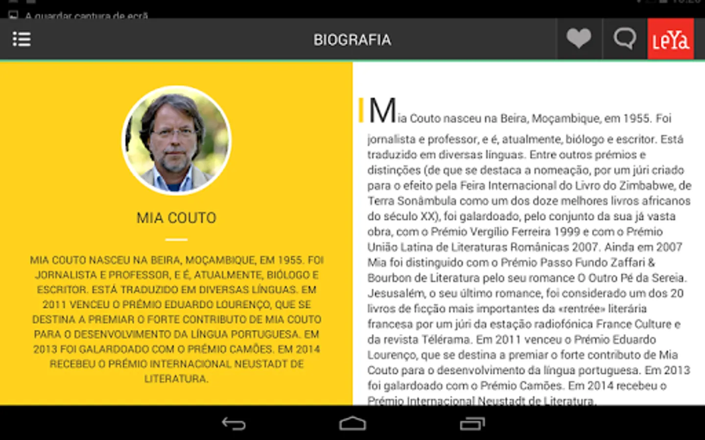 The app dedicated to Mia Couto want to be YOUR app when you want to know the latest news around the author. One where quick and easy access to the publishing catalog, know the latest news and views of the author and his work and monitors the activity of Mia Couto. In real time you can know how close is Mia Couto himself. Whether you present your latest book or in conversation with your readers. Like you!