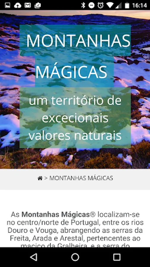 Official application of the territory of Magic Mountains, encompassing the territories of the mountains of Arada, Freita and Montemuro. Explore the region through interactive maps, image galleries, videos and virtual tours, know about the best places to visit, what to do, where to sleep and where to eat. Welcome to Magic Mountain!