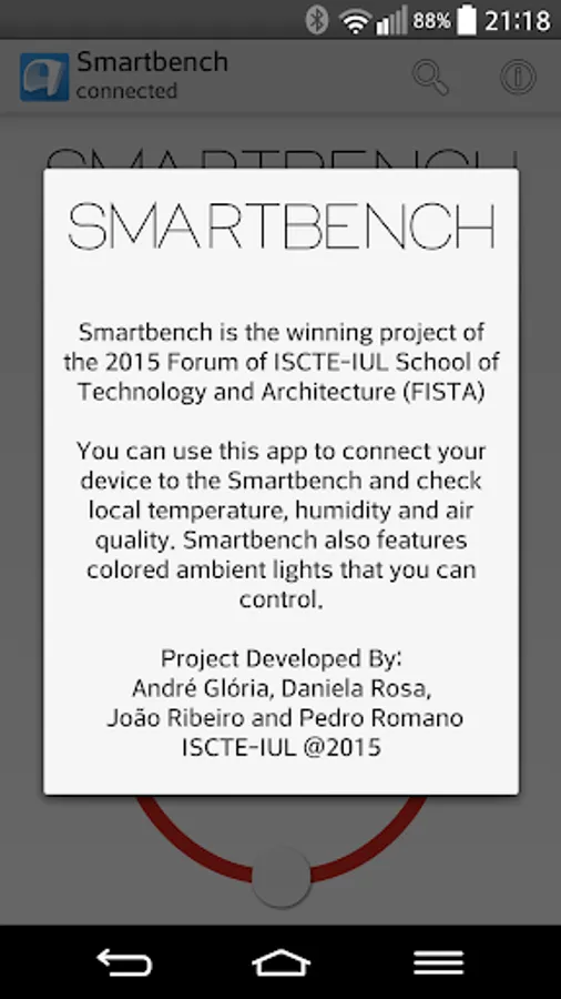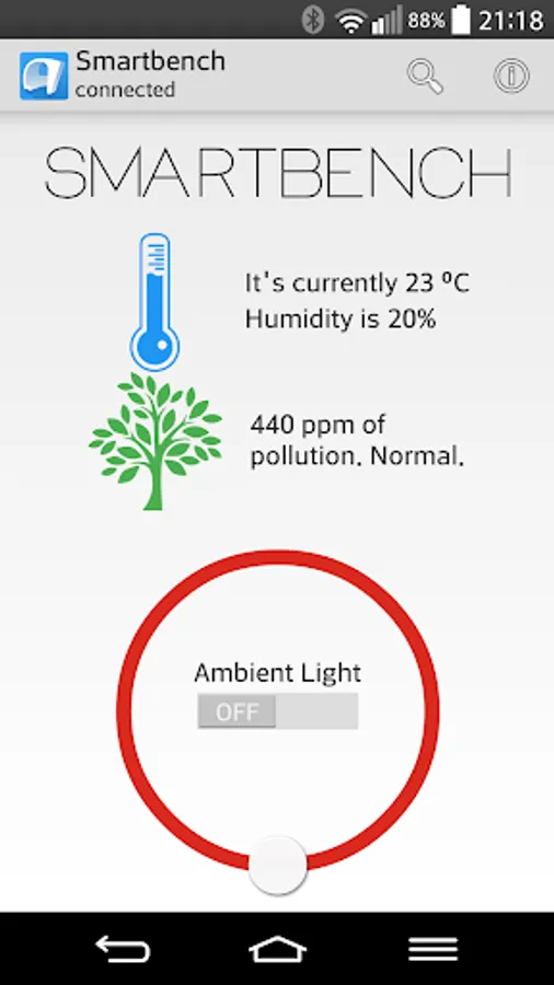 With this app, you can connect your Android device to Smartbench via Bluetooth, access ambient info and control a set of colored LED ambient lights.