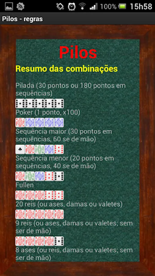 Each die has 6 faces of poker: ace, king, queen, jack, ten nine. Nine also has the name "Pilo". The name of this game comes from the combination of data that can generate more points