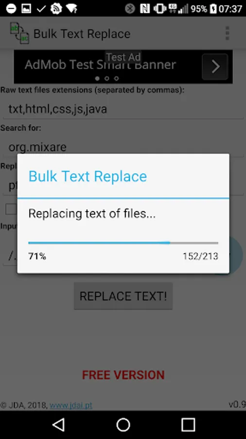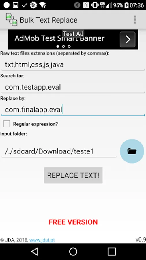 The output will be created in the device "download" directory, with the same input tree directory structure. The files inside will be an unmodified copy of the originals if no text replace was done, or an updated version if a replacement took place. Files with a different extension than the ones to analyse will be copied to the destination as well.